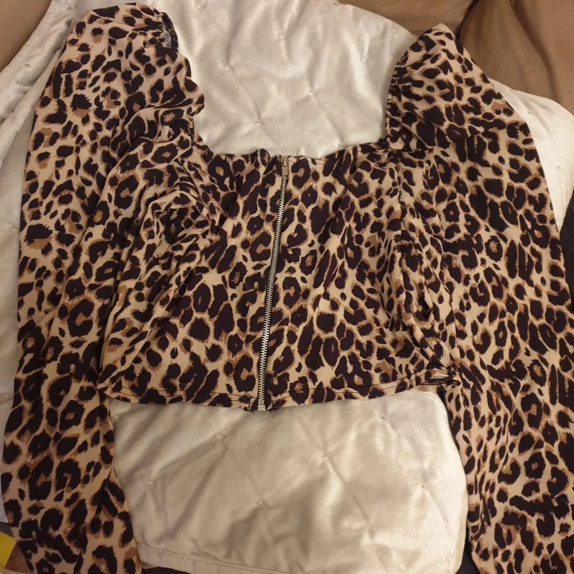 Passar M och ev s. Kortare blus i leopardmönster. Skönt o svalt tyg perfekt till sommaren. Dragkedja i ryggen. Jag har aldrig använt den så den är helt ny. 🌸