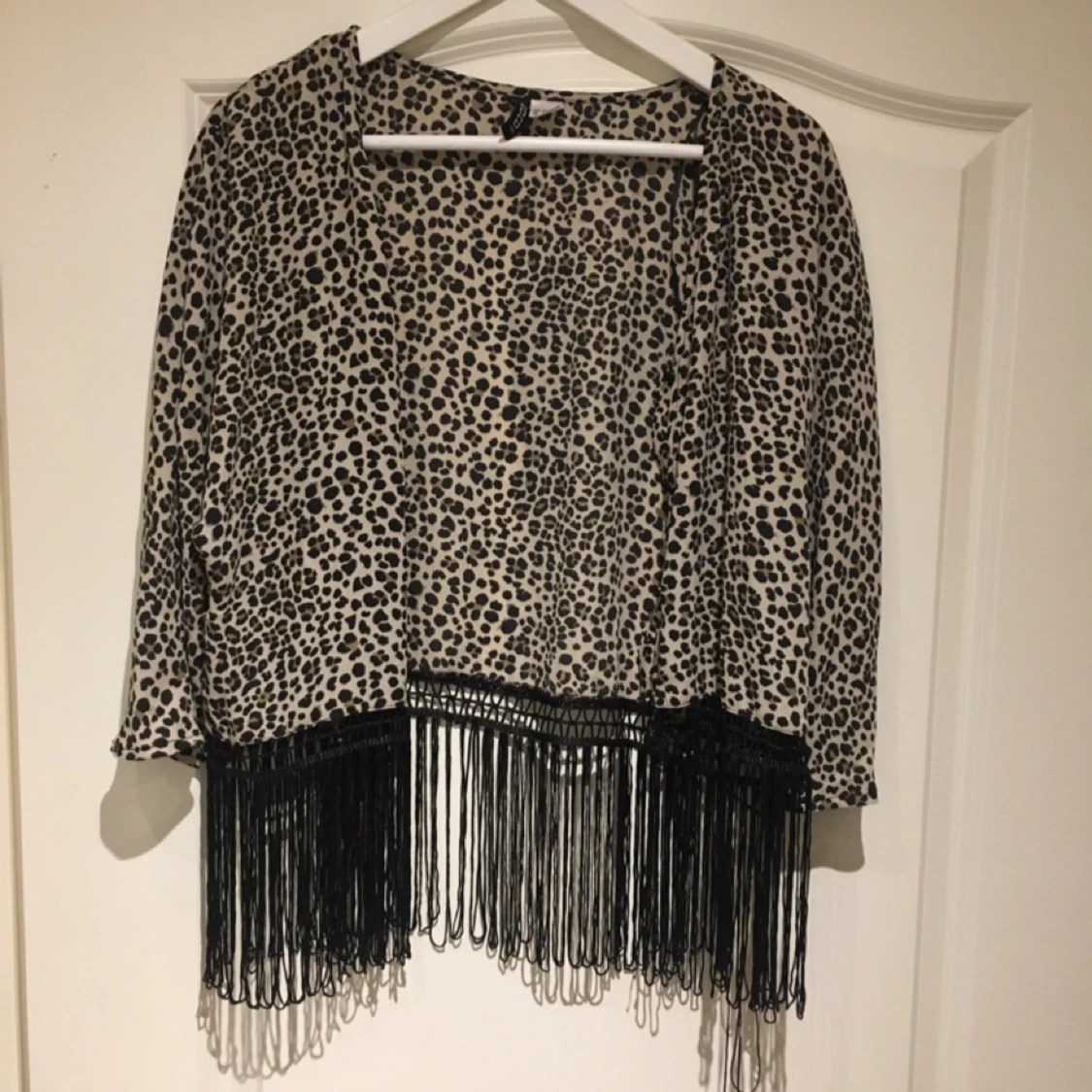 Leopardmönstrad, tunn kofta med fransar. Knäppning fram om man vill. Strl 38.