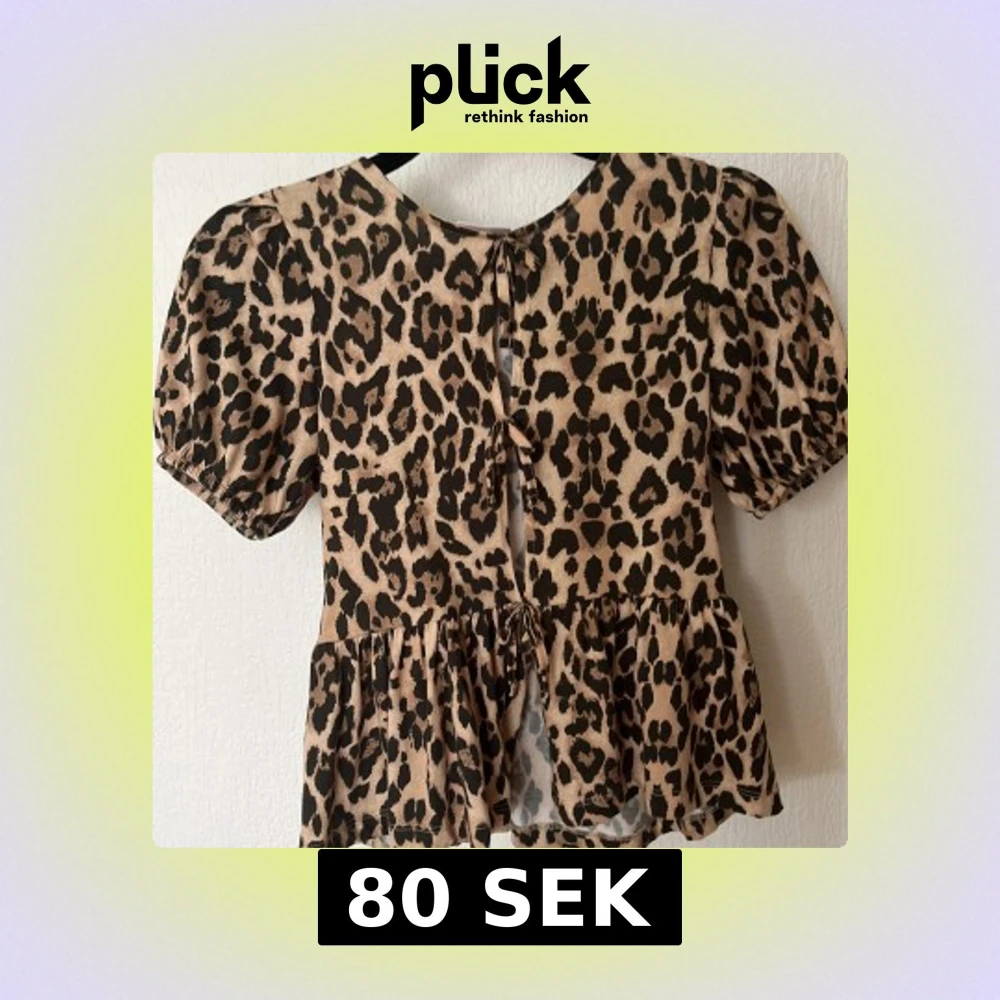 Säljer en beige och svart blus från Gina Tricot med leopardmönster. Toppen har puffiga korta ärmar, volang nedtill och snygga knytningar där fram. Perfekt för dig som vill sticka ut med ett djuriskt print och coola detaljer.