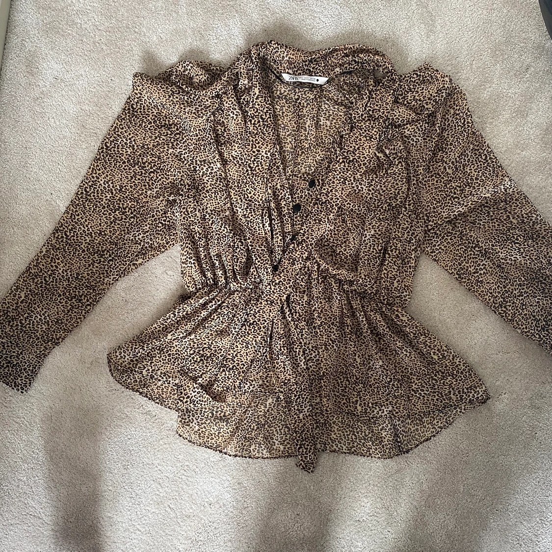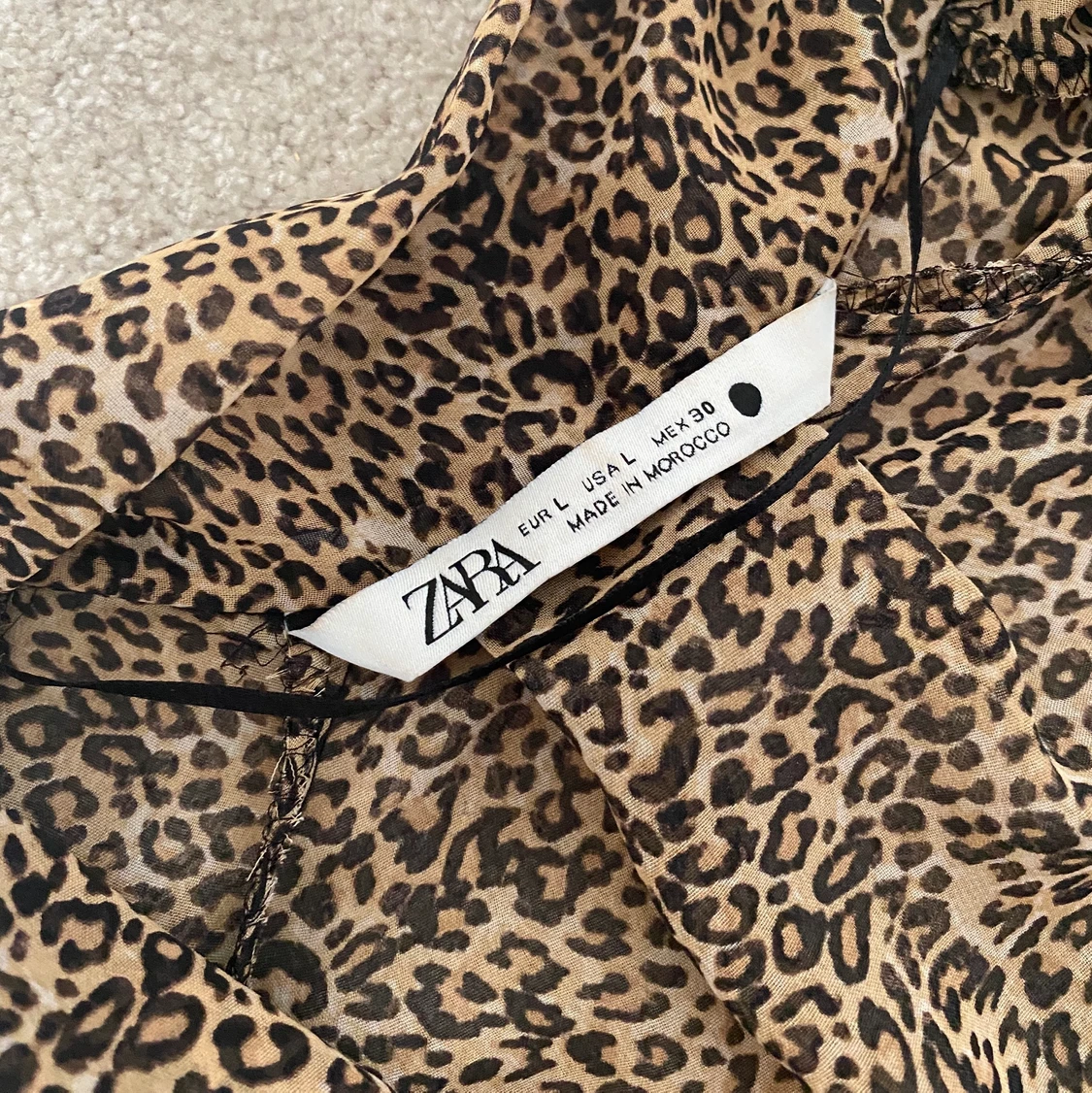 Leopardmönstrad blus från Zara med resår i midjan och ”slips” som kan knytas eller hänga löst (som på bilden). Använd ett fåtal gånger, resåröglan till knappen högst upp har gått av men kan lätt sys fast igen! Storlek L, jag är 175 cm för referens.