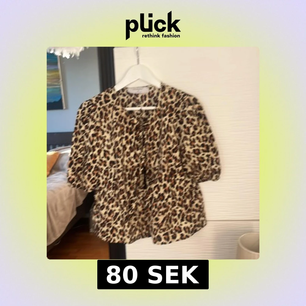 Säljer en snygg blus från Bubbleroom med leopardmönster i beige, brun och svart. Blusen har puffiga korta ärmar och knytning fram vid halsen. Perfekt för dig som vill sticka ut med ett djuriskt print och coola detaljer.