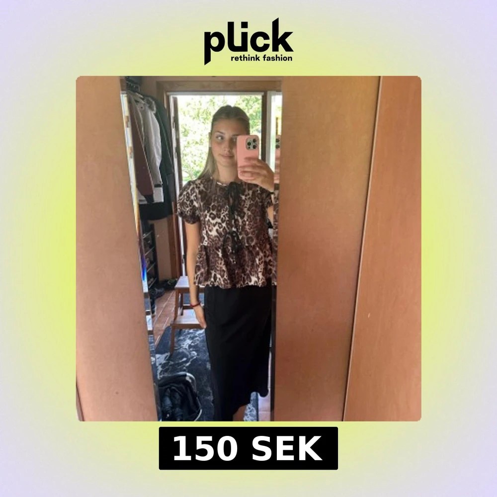 Snygg leopardmönstrad blus med korta ärmar och knytband i halsen. Matchas med en elegant svart långkjol. Perfekt för en trendig look. Endast testad