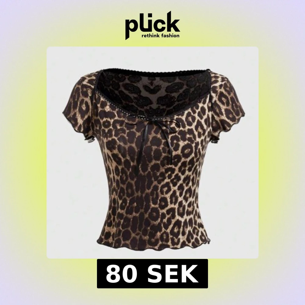 Trendig leopardmönstrad topp med spetsdetaljer vid halsringningen och en liten rosett framtill. Toppen har korta ärmar och en figurnära passform, perfekt för en djärv look.