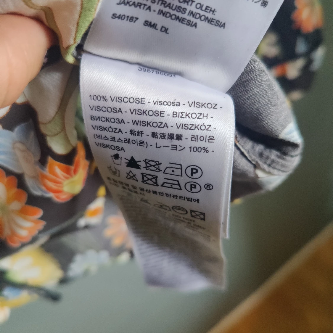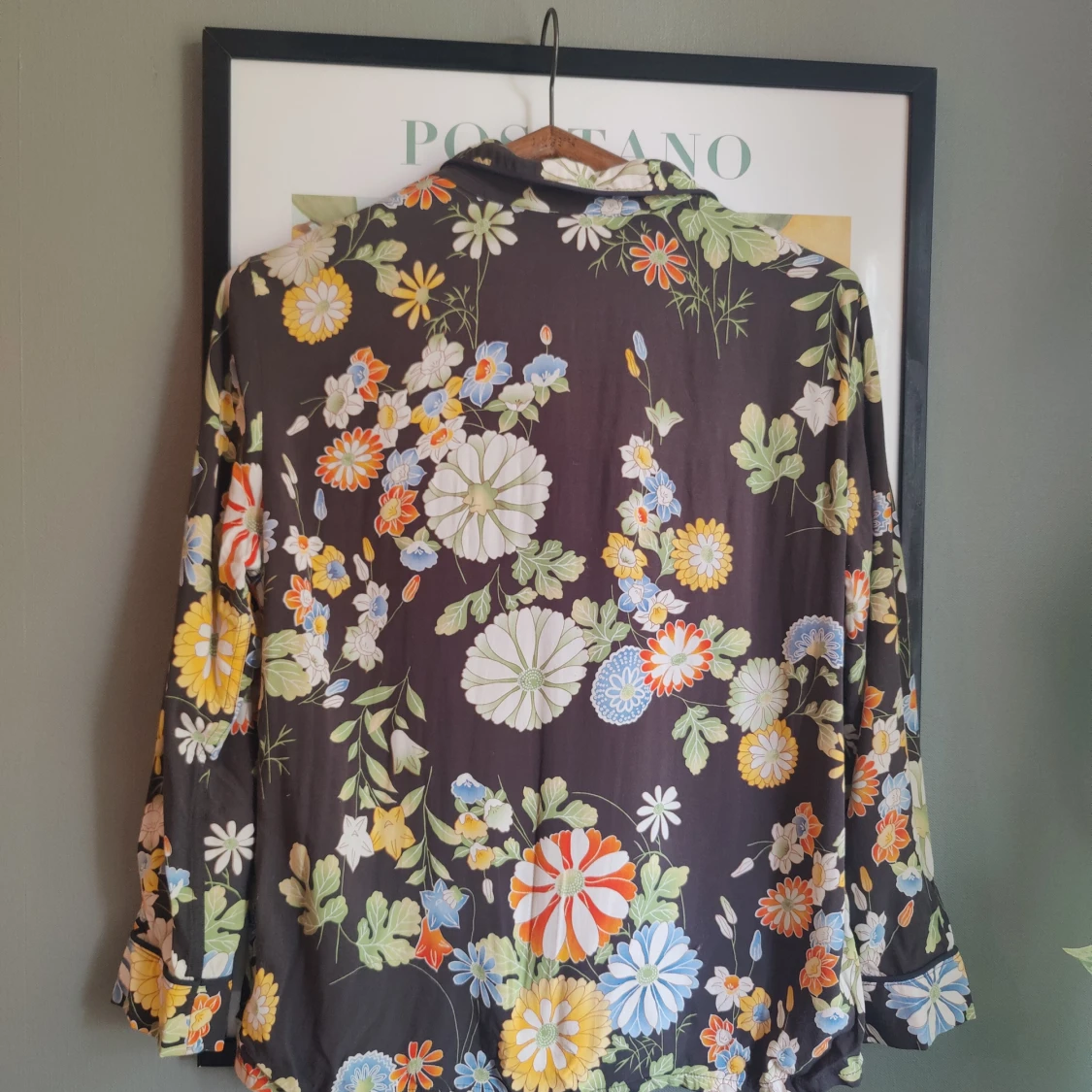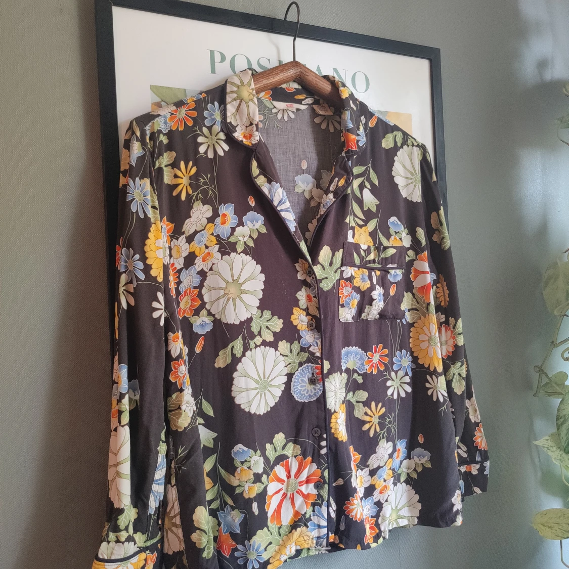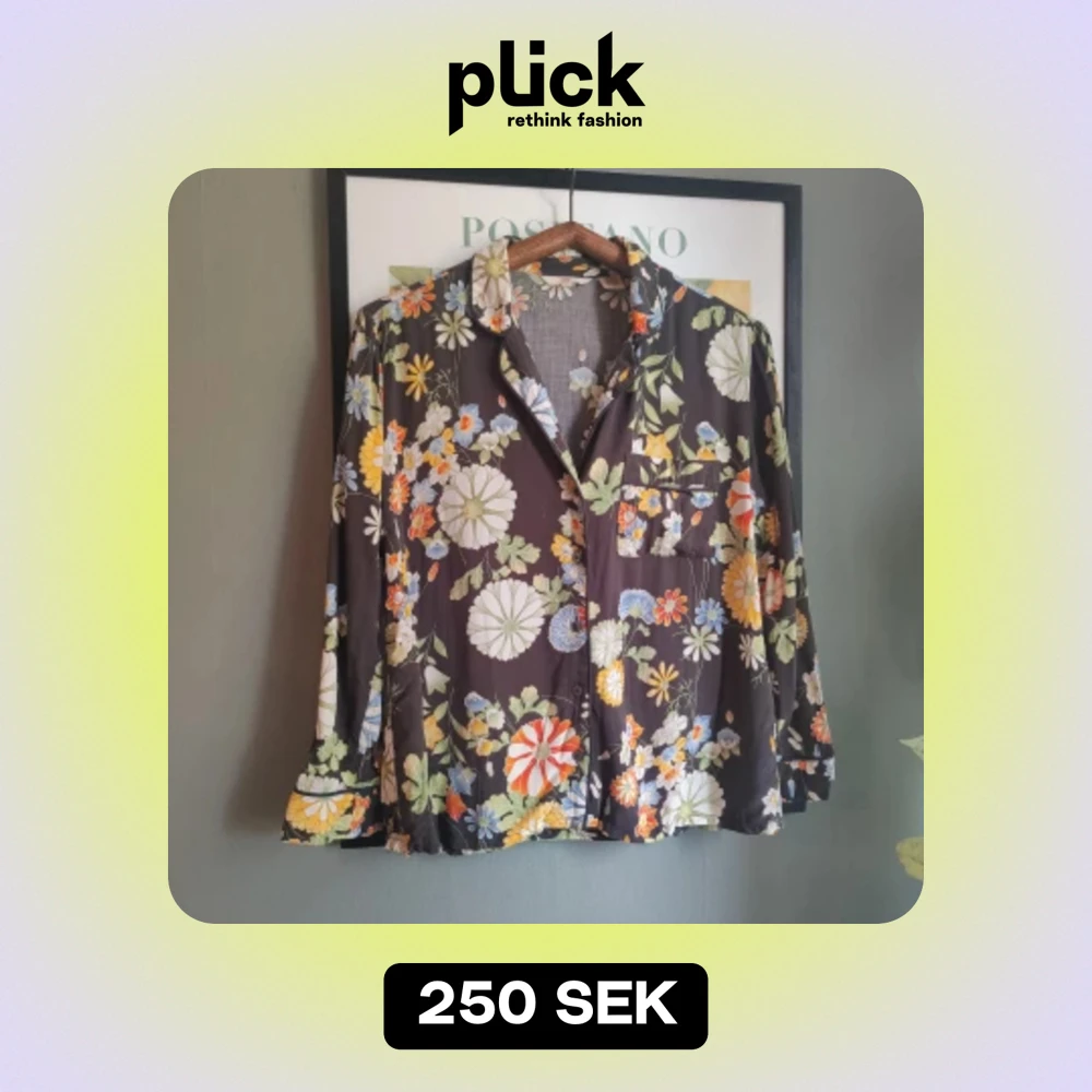 Snygg blus med blommigt mönster i mörka färger. Blusen har en klassisk krage och knappar framtill. Sparsamt använd.