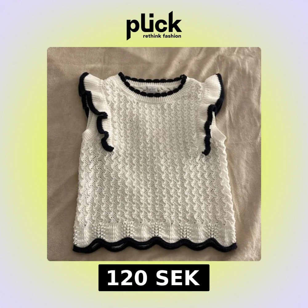 Söt vit stickad topp från Lindex med volangdetaljer och mörkblå kanter. Och passar till 10-13 år skulle jag säga.😊