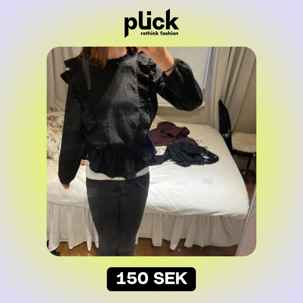Säljer en snygg svart blus med volangdetaljer. Den har långa ärmar och en fin passform som passar perfekt till både vardag och fest. Blusen är i ett mjukt och bekvämt material.