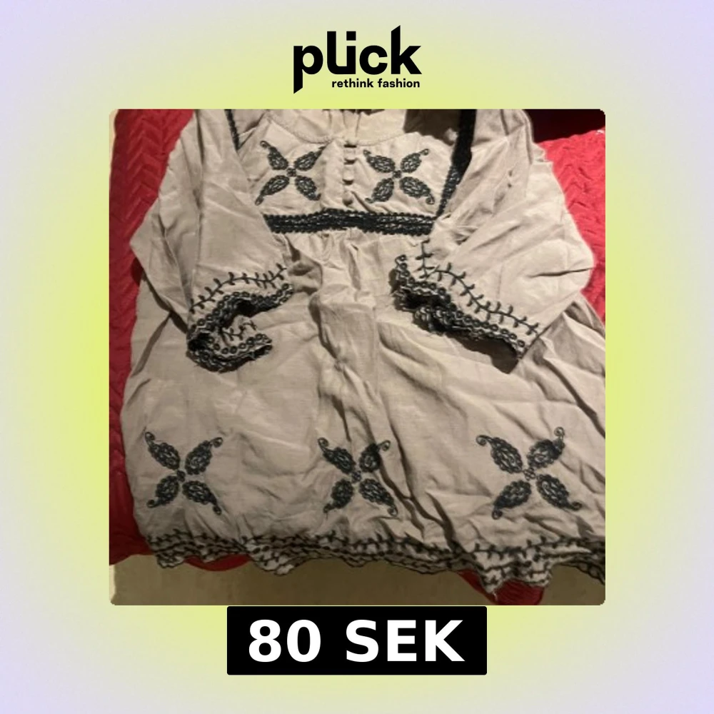 Charmig beige klänning från Lindex med svarta broderade detaljer och knappar framtill. Klänningen har en lös passform och korta ärmar, perfekt för en avslappnad stil.