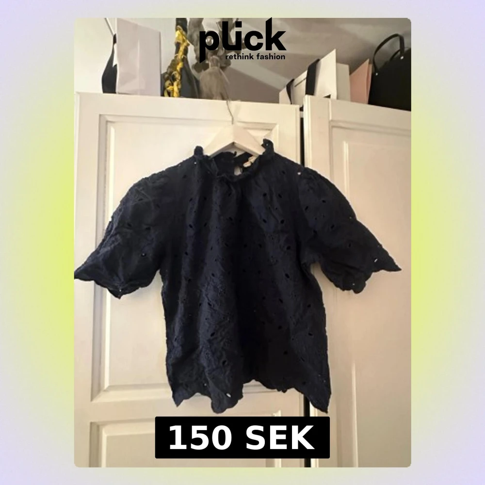 Snygg mörkblå blus från Lindex, kollektionen Holly & Whyte. Blusen har korta puffärmar och är gjord i ett broderat tyg med hålmönster. Rund halsringning med liten volangkant och knäppning bak i nacken. Perfekt för en trendig och chic look.