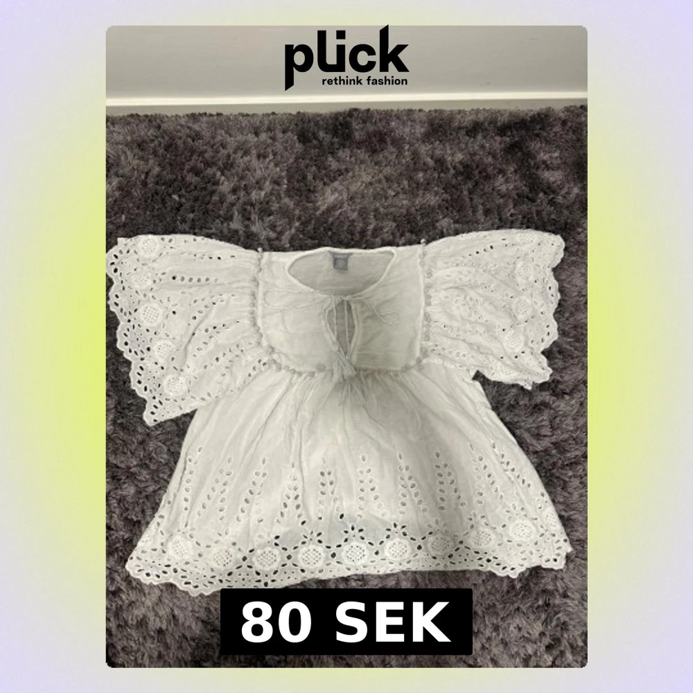 Superfin vit blus från Lindex med broderade detaljer och vida, korta ärmar. Blusen har knytning framtill och vackert hålmönster längs kanterna och ärmarna. Perfekt för varma dagar och ger en romantisk känsla till din outfit.