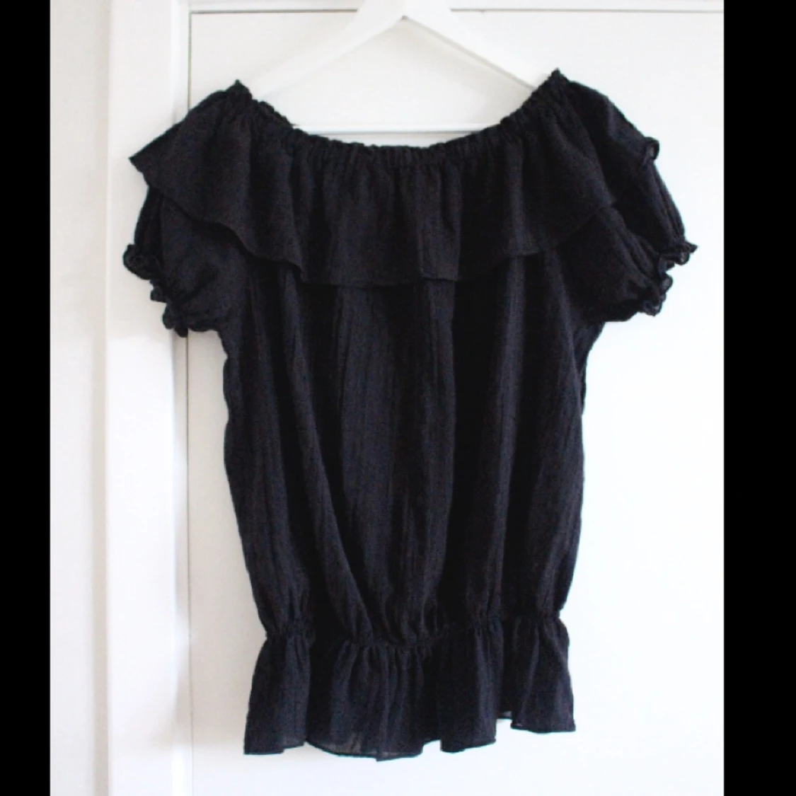 Snygg svart blus med volanger och fina detaljer från Lise Sandahl. Helt oanvänd! Säljer även en likadan i vitt.