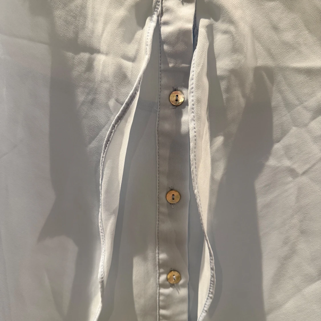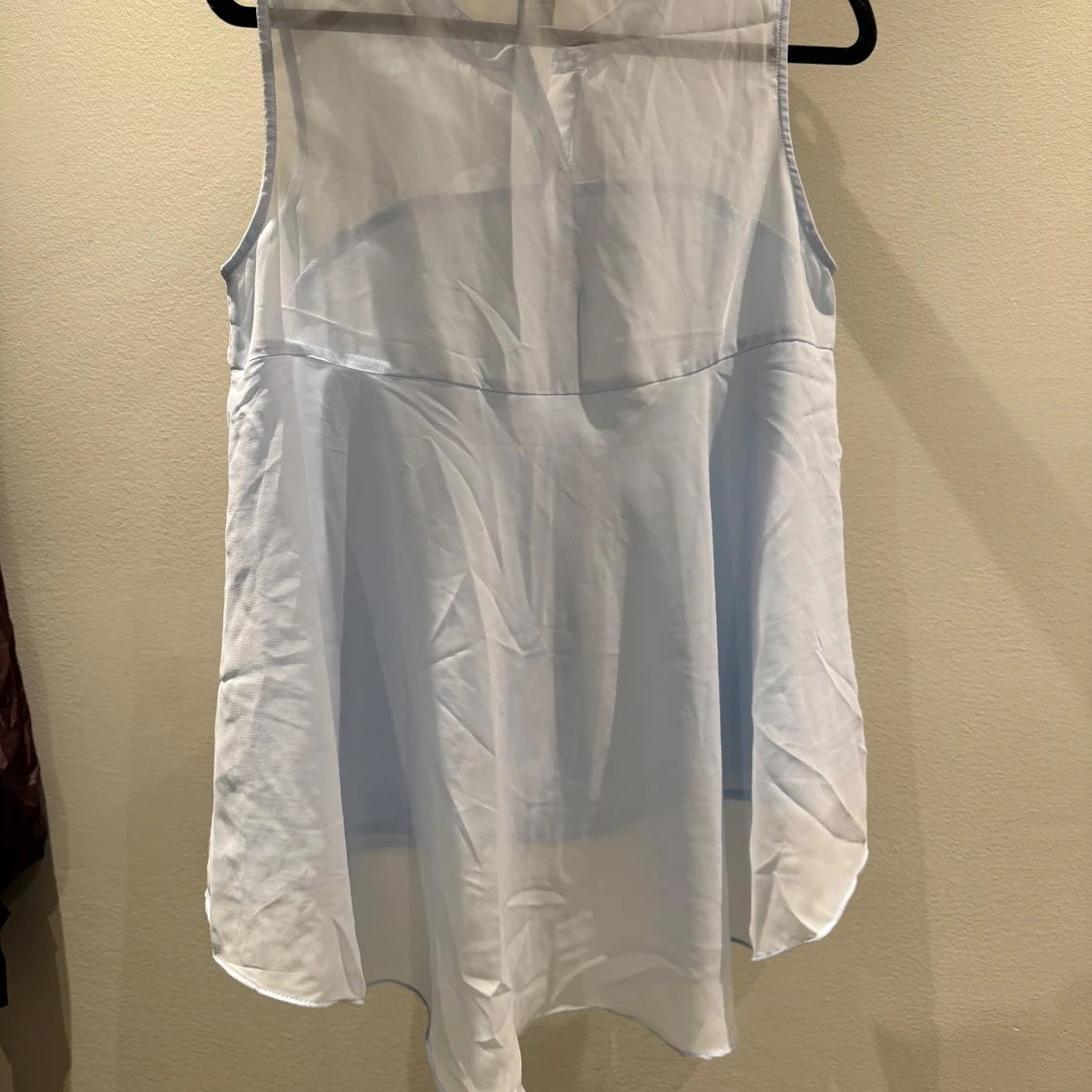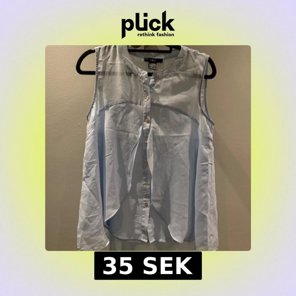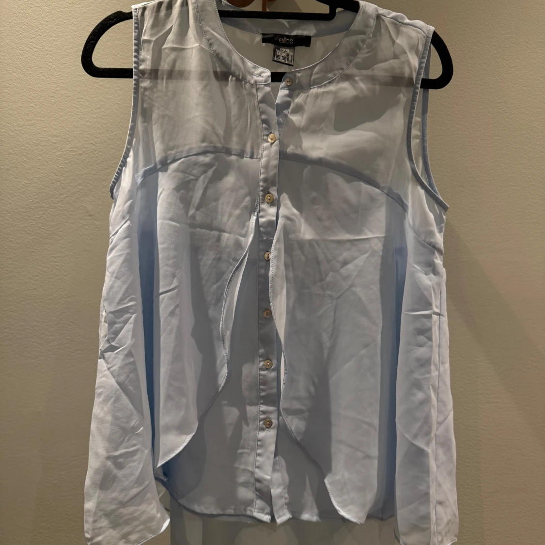 Säljer en ljusblå ärmlös blus från Ellos med rund halsringning och knäppning framtill med små knappar. Blusen har en lös passform och är tillverkad i ett lätt, mjukt tyg som ger en luftig känsla. Perfekt för alla tillfällen och enkel att styla.