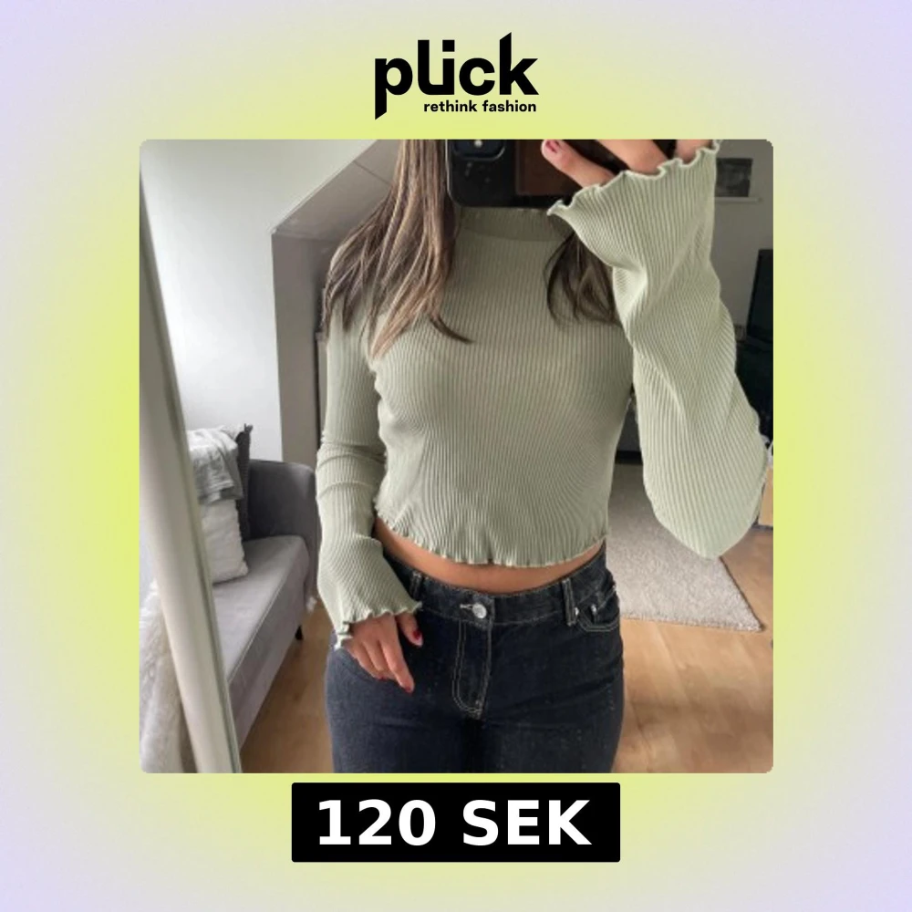 Säljer en ljusgrön ribbad tröja från NA-KD i stl S. Den har långa vida ärmar och vågiga kanter vid ärmslut, hals och nederkant. Skriv vid frågor!
