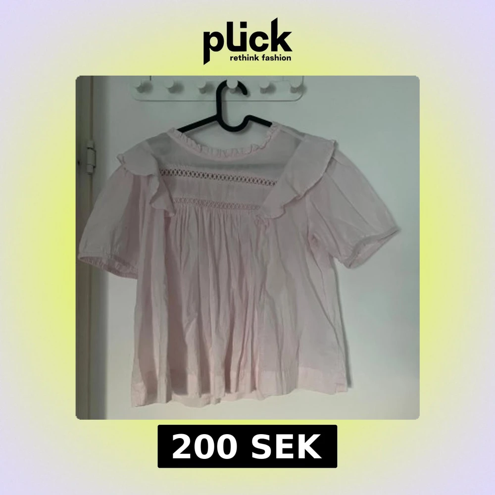 Supersöt ljusrosa blus från Gina Tricot med volangdetaljer vid axlarna och rynkade partier. Blusen har korta ärmar och fina broderade band över bröstet. Perfekt för dig som gillar romantisk och luftig stil.