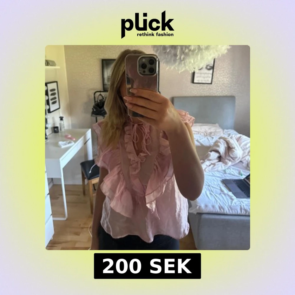 Supersöt ljusrosa blus med volanger längs v-ringningen och knytband vid halsen. Luftig och lätt i materialet, perfekt för vår och sommar. Blusen är köpt från Kappahl. Har aldrig använt den utan bara testad och lappen är kvar.. Den är i storlek S, men säljer även en i XS också. Nypris 399kr🤍