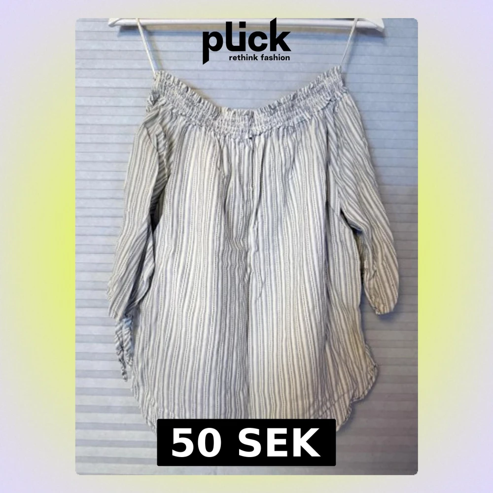 Snygg offshoulder blus med vita och blå smala ränder. Blusen har resår upptill och vida ärmar som ger en avslappnad känsla. Tillverkad i ett lätt och luftigt tyg, perfekt för varma dagar.