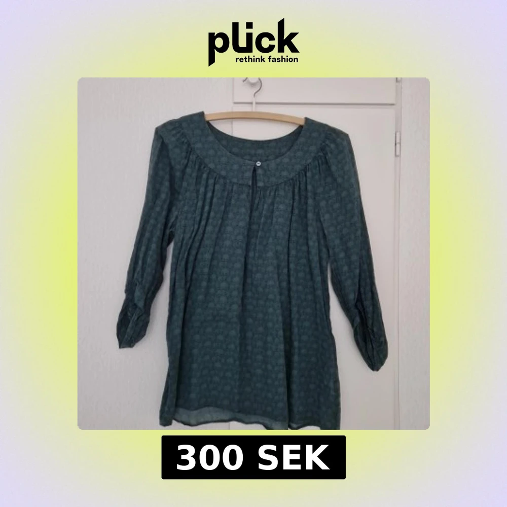 Säljer en mörkgrön blus från Nygårdsanna med diskret blommigt mönster. Blusen har trekvartsärm, rund halsringning och en knapp framtill. Tillverkad i 100% bomull vilket gör den mjuk och skön att bära.