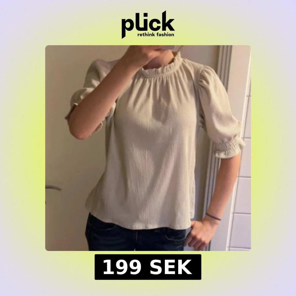 Säljer en stilren beige blus med puffiga trekvartsärmar och rynkad halsringning. Blusen har en lös passform och är perfekt för en trendig vardagslook.