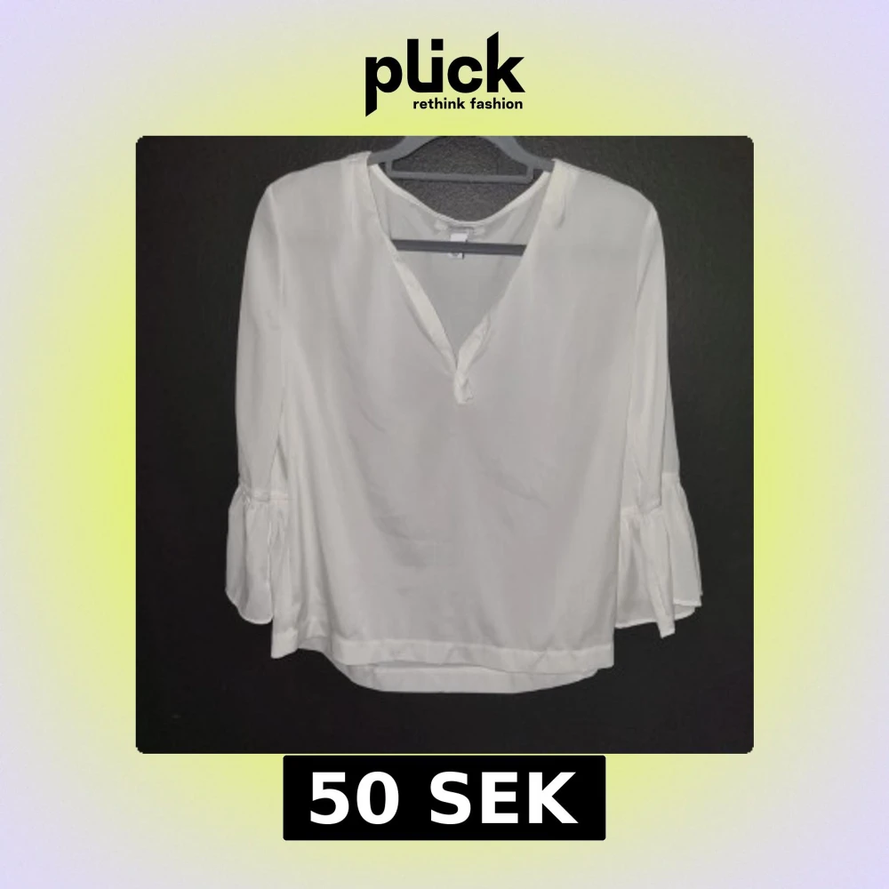 Säljer en vit blus från Notion 1.3 i storlek M. Blusen har långa ärmar och v-ringad. Perfekt för en stilren och feminin look.