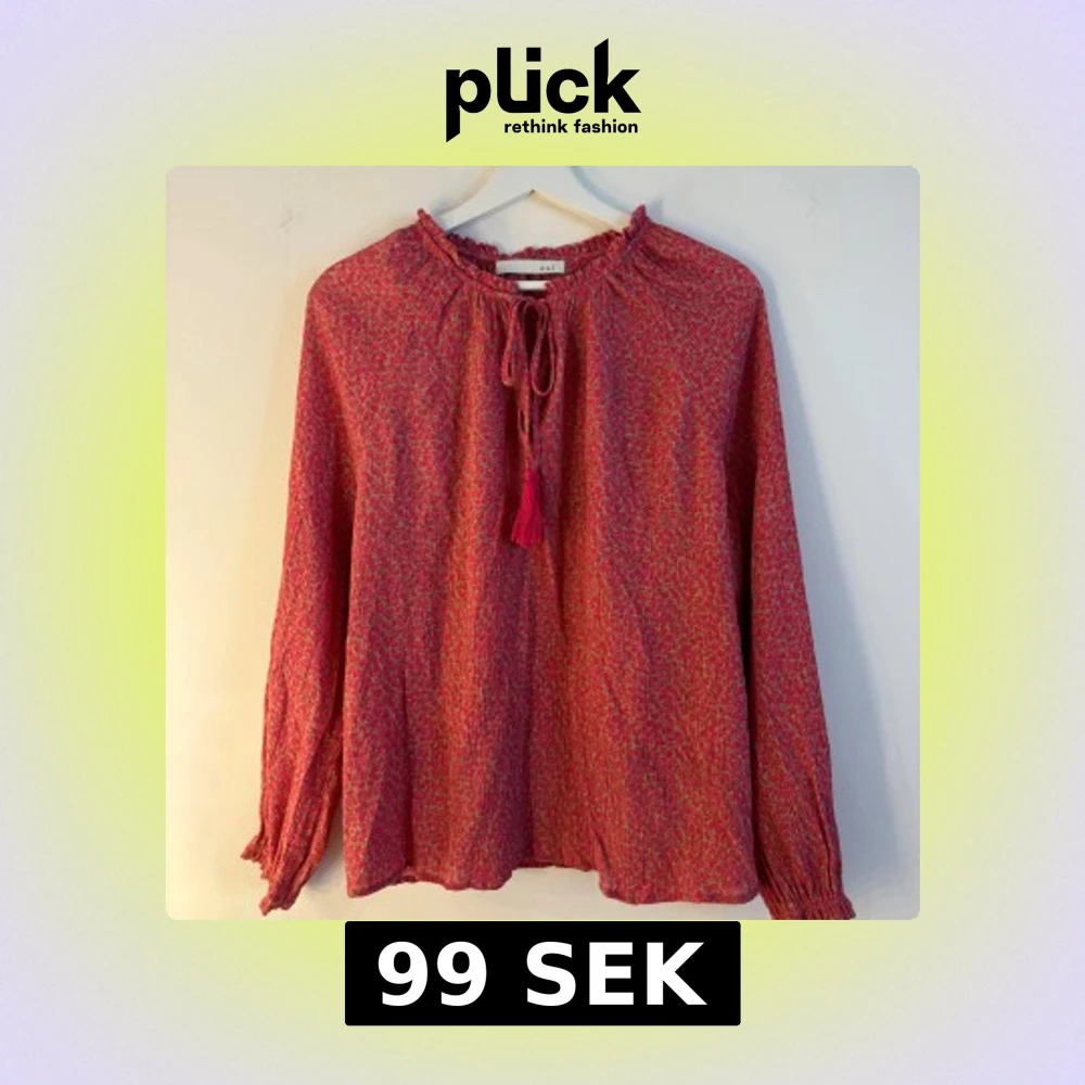 Rosa blus med ett mönster i guldbrunt. Blusen har långa ärmar med resår vid handleden och en rynkad halsringning med knytband och en tofs. Storlek 38