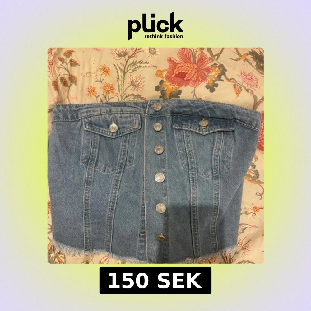 Säljer en blå jeanstopp med fransig nederkant och knappar framtill. Toppen har två fickor med lock och knappdetaljer samt smock baktill för extra stretch.