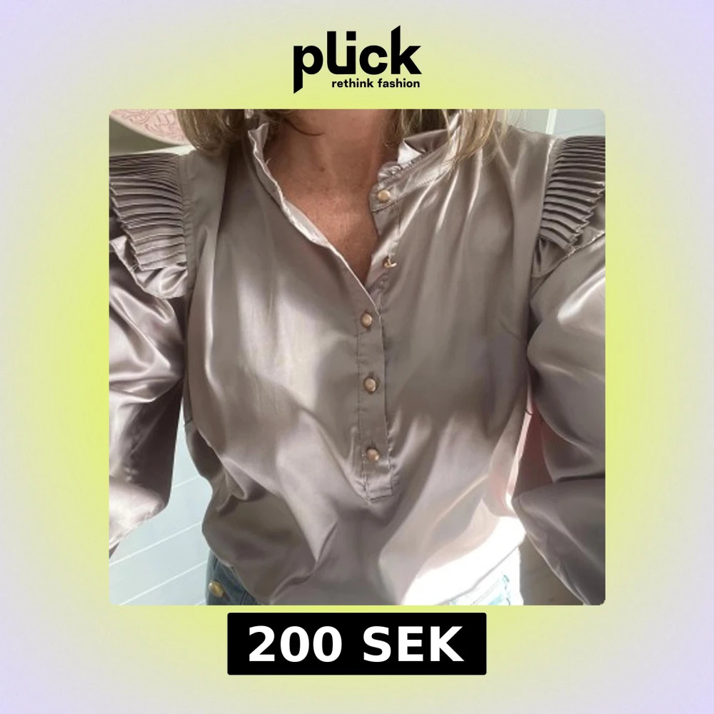 Säljer en beige blus med puffärmar och plisserade detaljer på axlarna. Blusen har knappar framtill och en lätt glansig finish. Perfekt för dig som vill ha något unikt och stilrent i garderoben. Passar S-L beroende på hur du vill ha den.