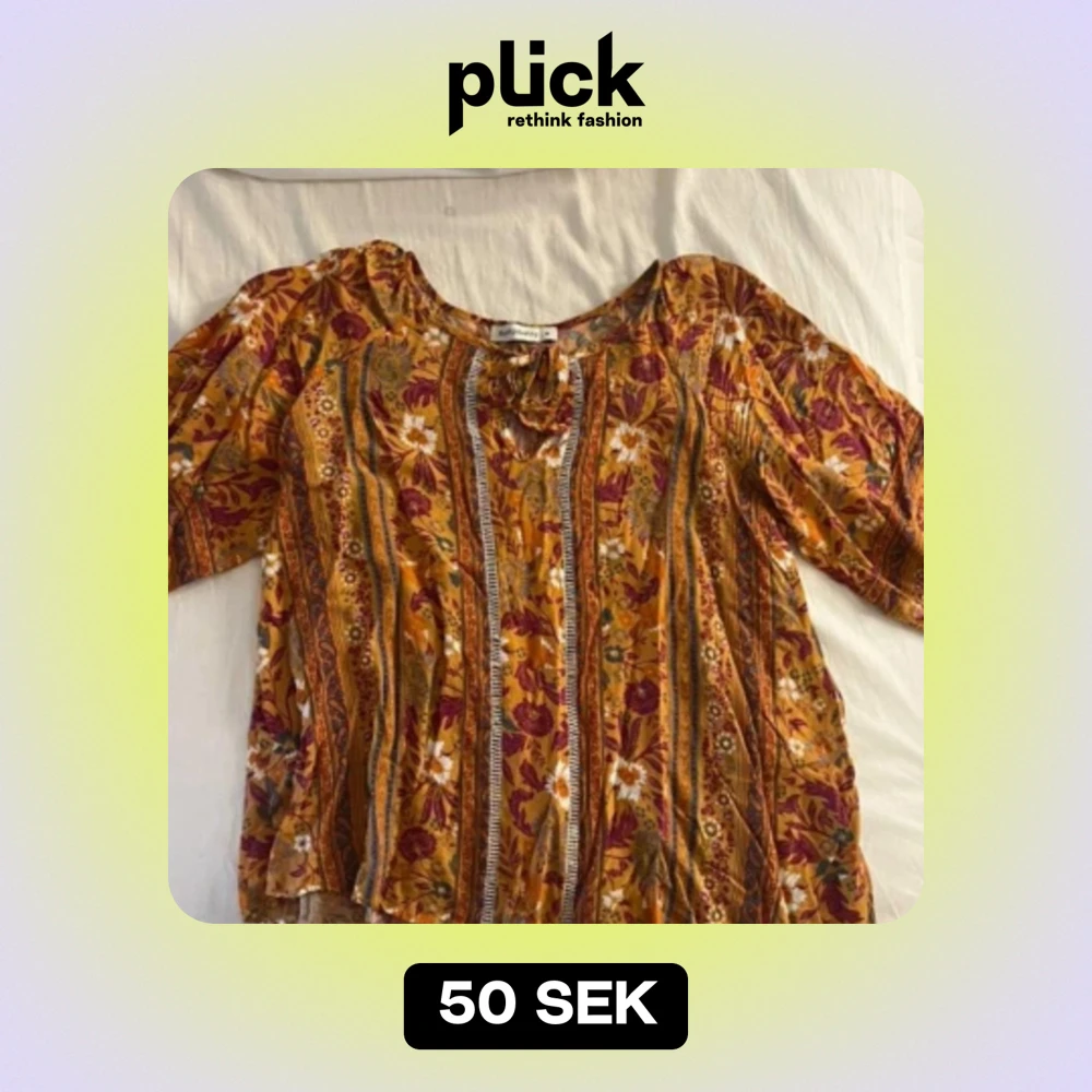En vacker blus med ett mönster av blommor och ränder i orange, rött, vitt och blått. Blusen har en rund halsringning och en knutning i fram. Den har tre fjärdedels ärmar och en lös passform. Super fin säljs för 50