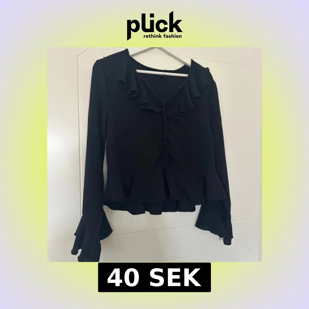 Svart topp/blus med knytning vid halsen och dekorativa knappar. Använd en del så noppig i tyget men fortfarande hel!