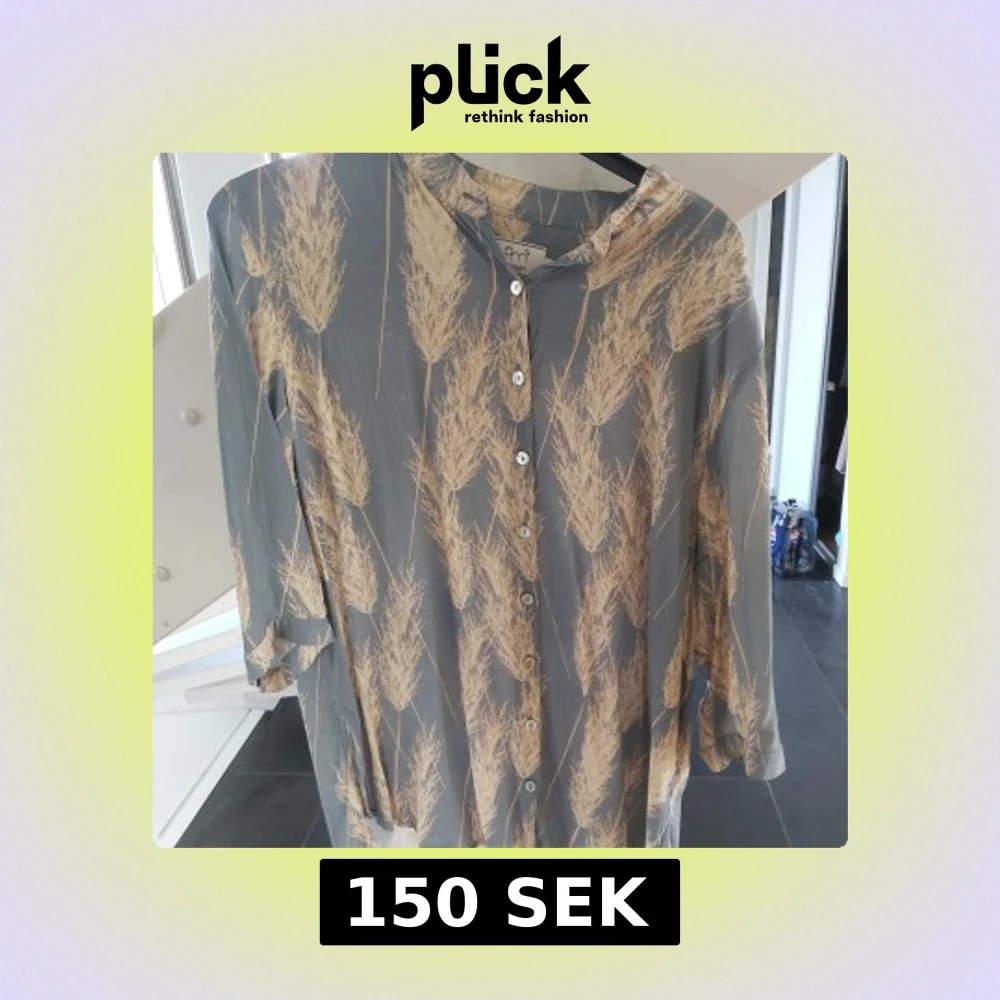 Säljer en skjorta med blå botten och beige naturinspirerat mönster. Skjortan har knappar hela vägen framtill och trekvartsärmar.