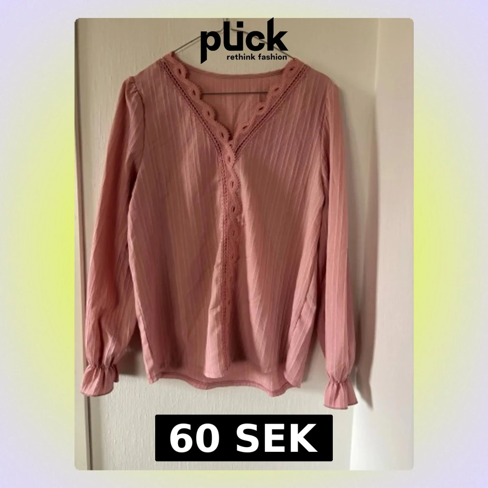 Söt rosa blus med långa ärmar och v-ringning dekorerad med spets. Blusen har diskreta vertikala ränder och lätt puffade ärmslut med resår. Perfekt för en trendig och feminin look.