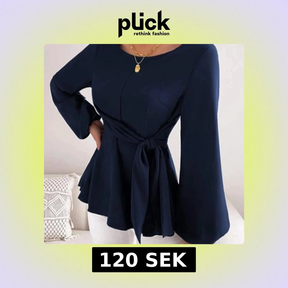 Elegant mörkblå blus med långa ärmar och ett knytband i midjan. Blusen har en rund halsringning och vida ärmar som ger en stilfull look.