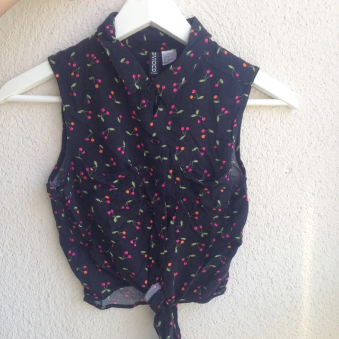 Söt magtröja med knut framtill. Körsbär på tyget.