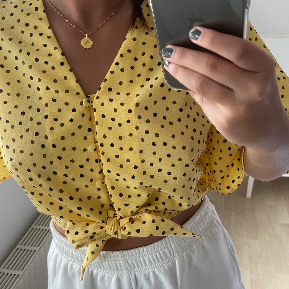 En superfin gul blus med svarta prickar och knyte i slutet!