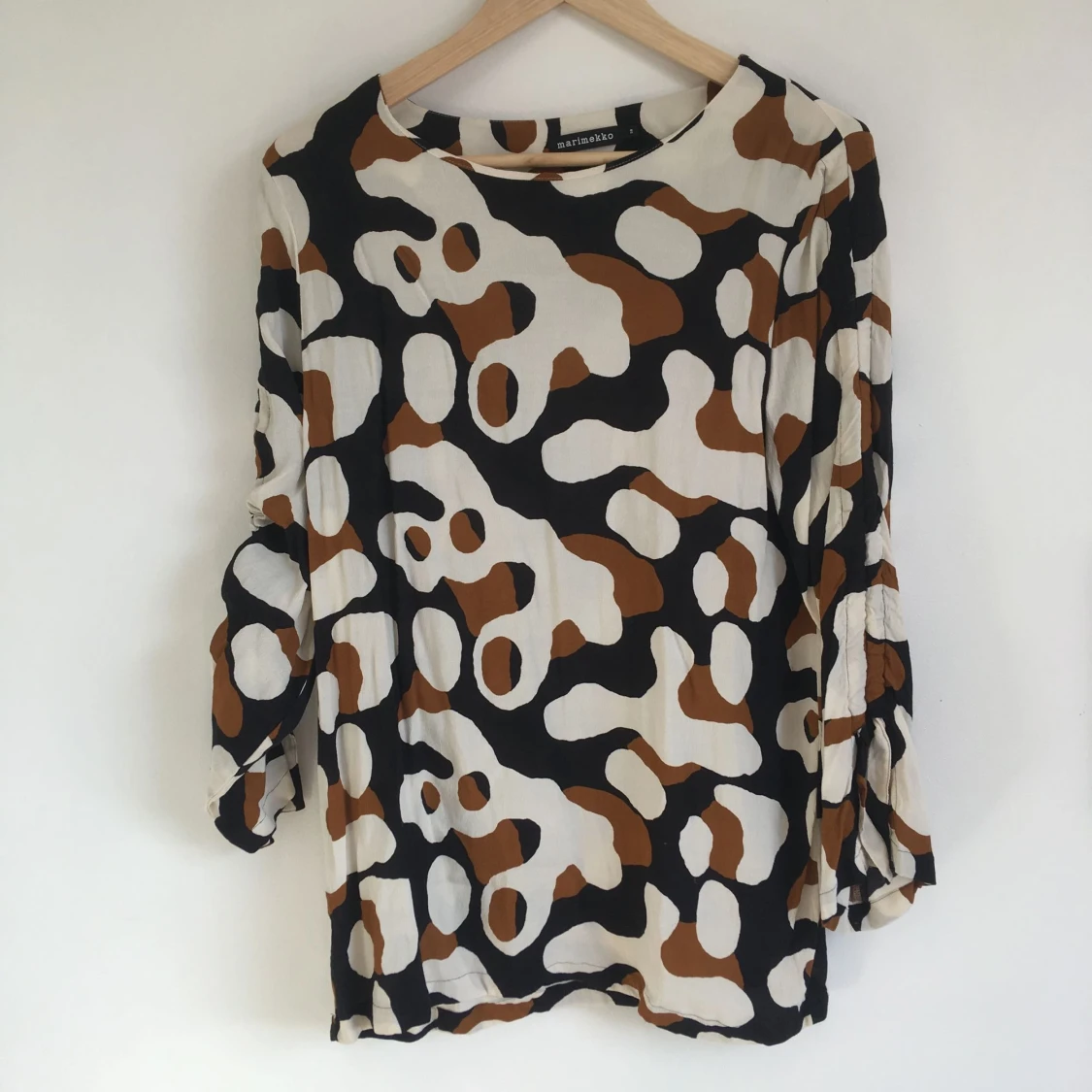Långärmad blus i viskos crepe från Marimekko. Dragsko i ärmarna så att man kan rynka upp dem lite om man vill. Lös passform.
