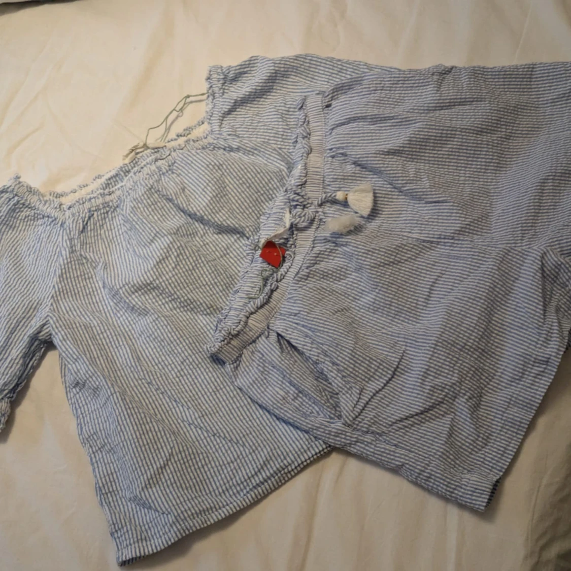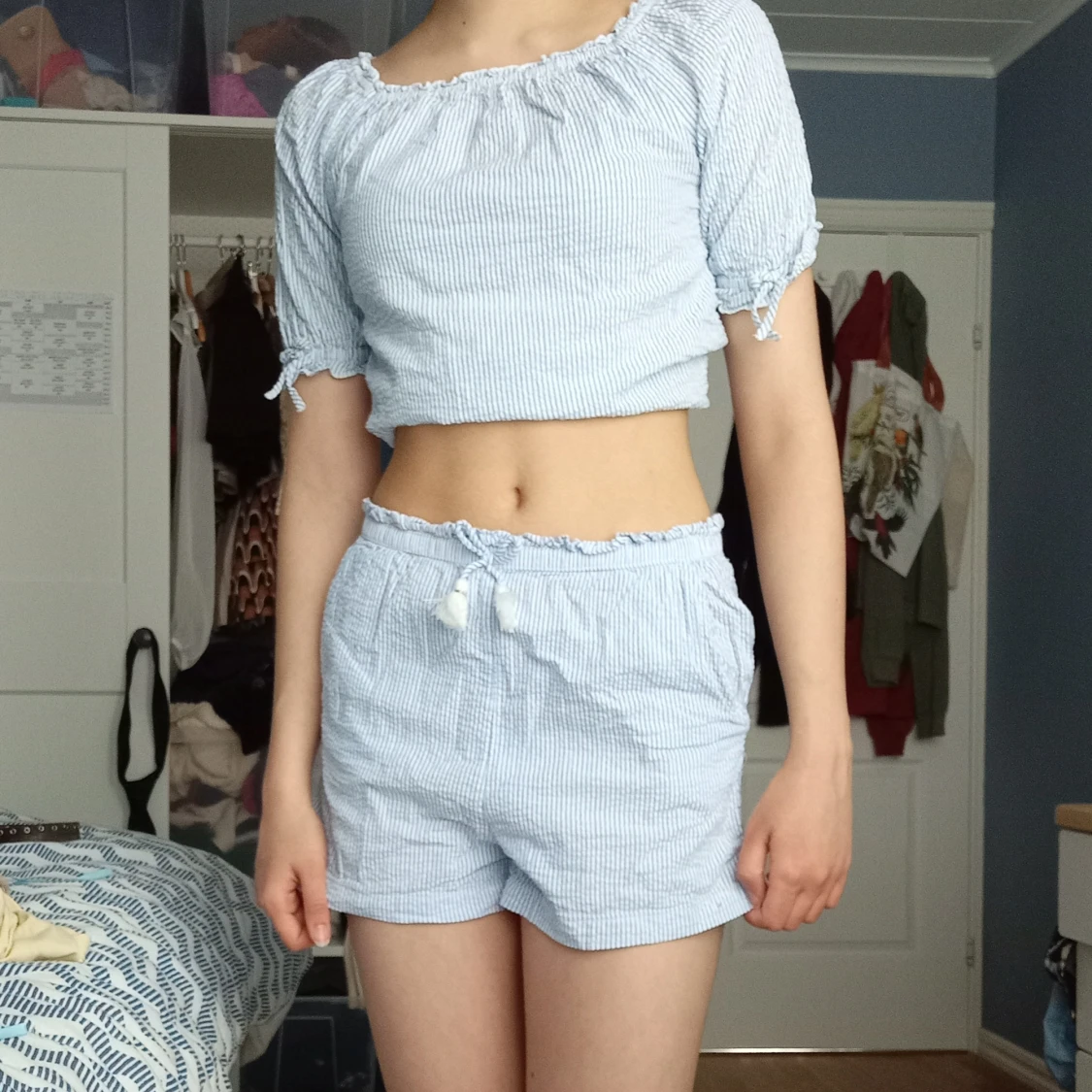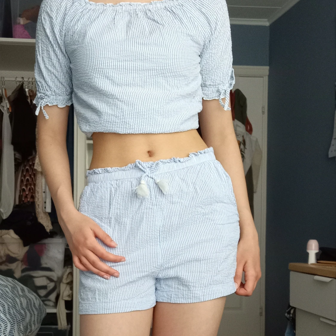 Superfint matchande sommarset från Hm, använd ett fåtal gånger och i bra skick. Första bilderna har jag scrunchat upp tröjan, sista är hur den sitter utan. Perfekt nu när det är sommar:)