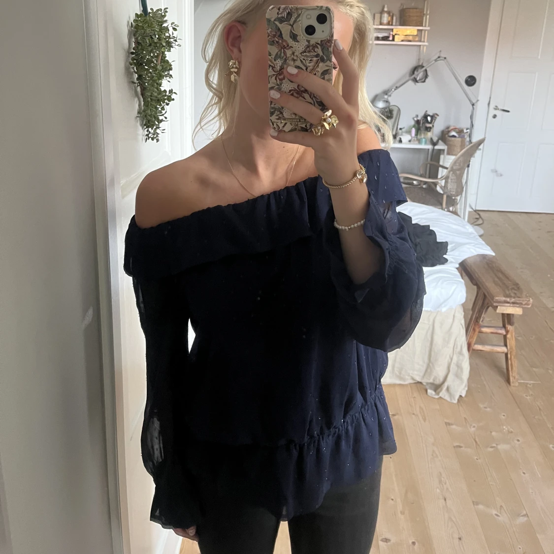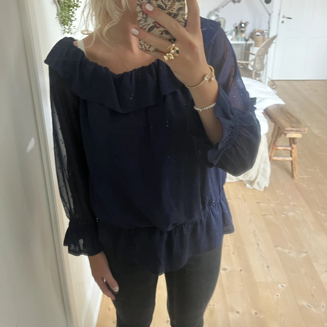 Mörkblå blus från Michel kors med ”prickar” (se bild 1). Kan både användas off shoulder men även som vanlig blus. Volang nedtill. Pris kan diskuteras💕ursprungspris 1100kr.