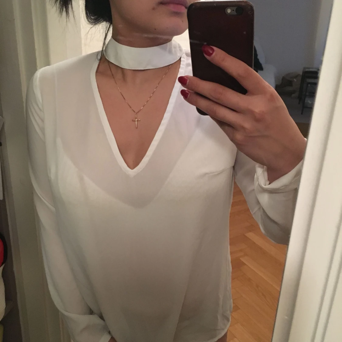 Fintröja med liten v-ringad öppning vid bröstet. Liknande ”siden” material. Stängning baktill (halsen) med knäppning.