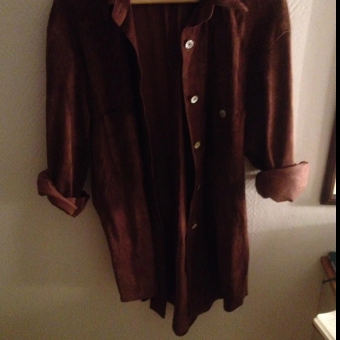 Så himla fin mockaskjorta ( riktig mocka) storlek 38/40 men väldigt långsmal. Inte så stor i axlarna med andra ord , säljer på grund av lite för lång.
