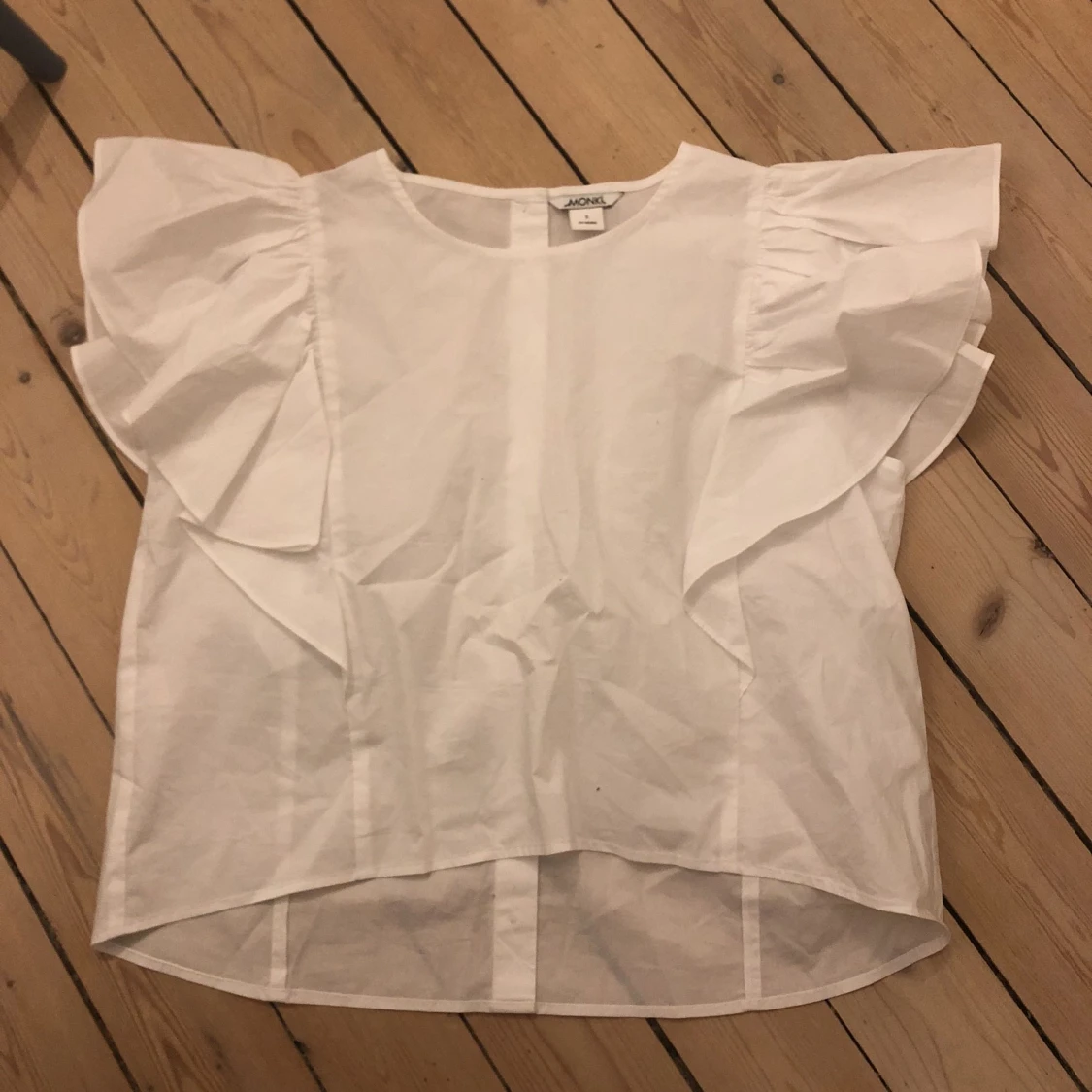 Blus med volanger på ärmarna. Fina knappar bak. Storlek small
