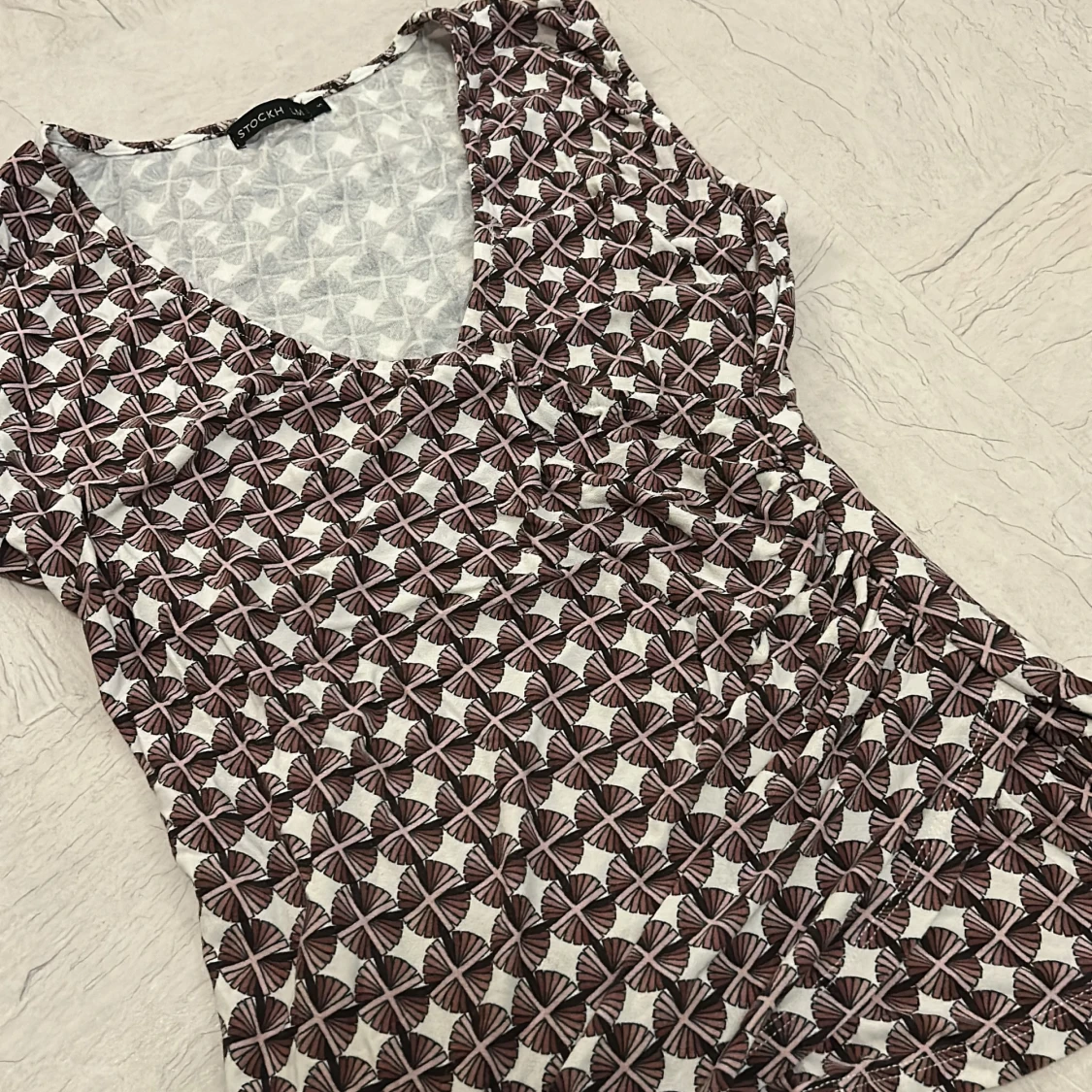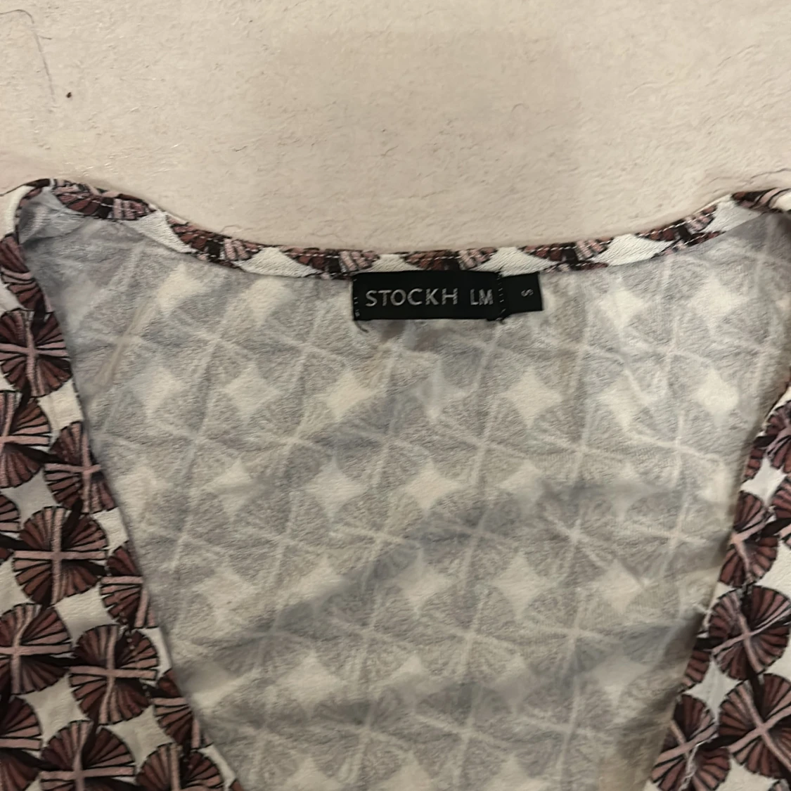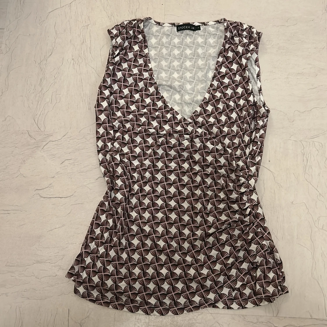 Tröja från Stockh LM med v-ringning och ärmlös design. Tröjan har ett unikt blommigt mönster i brunt och vitt, vilket ger en cool och modern look.