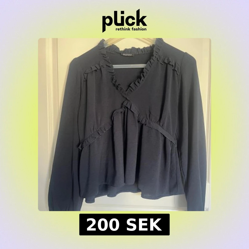 Säljer en elegant mörkblå blus från Missay med volangdetaljer och v-ringning. Blusen har långa ärmar och en lös passform, perfekt för en stilren look. Passar bra till både jeans och kjol.