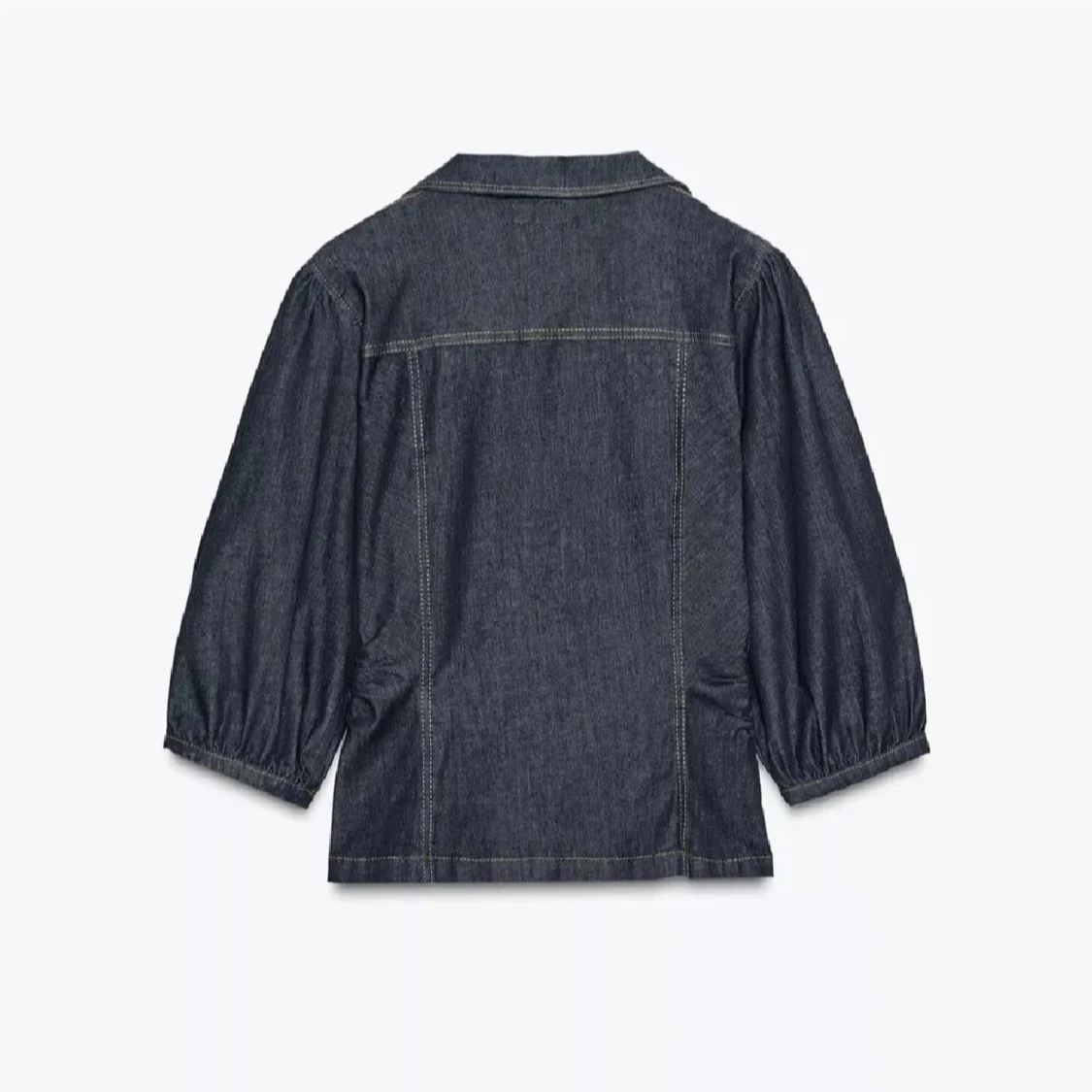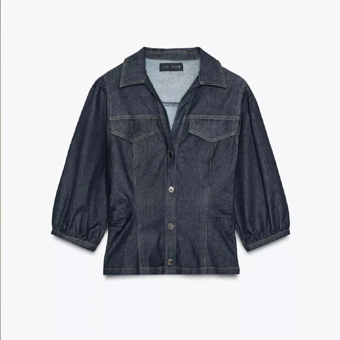 Trendig mörkblå jeansblus från Zara med markerade sömmar, trekvartsärmar med resår och snygga bröstfickor. Skjortan har figurnära passform, klassisk krage och knäppning framtill. Perfekt för dig som gillar en cool denimlook. Endast testad!!💓💓