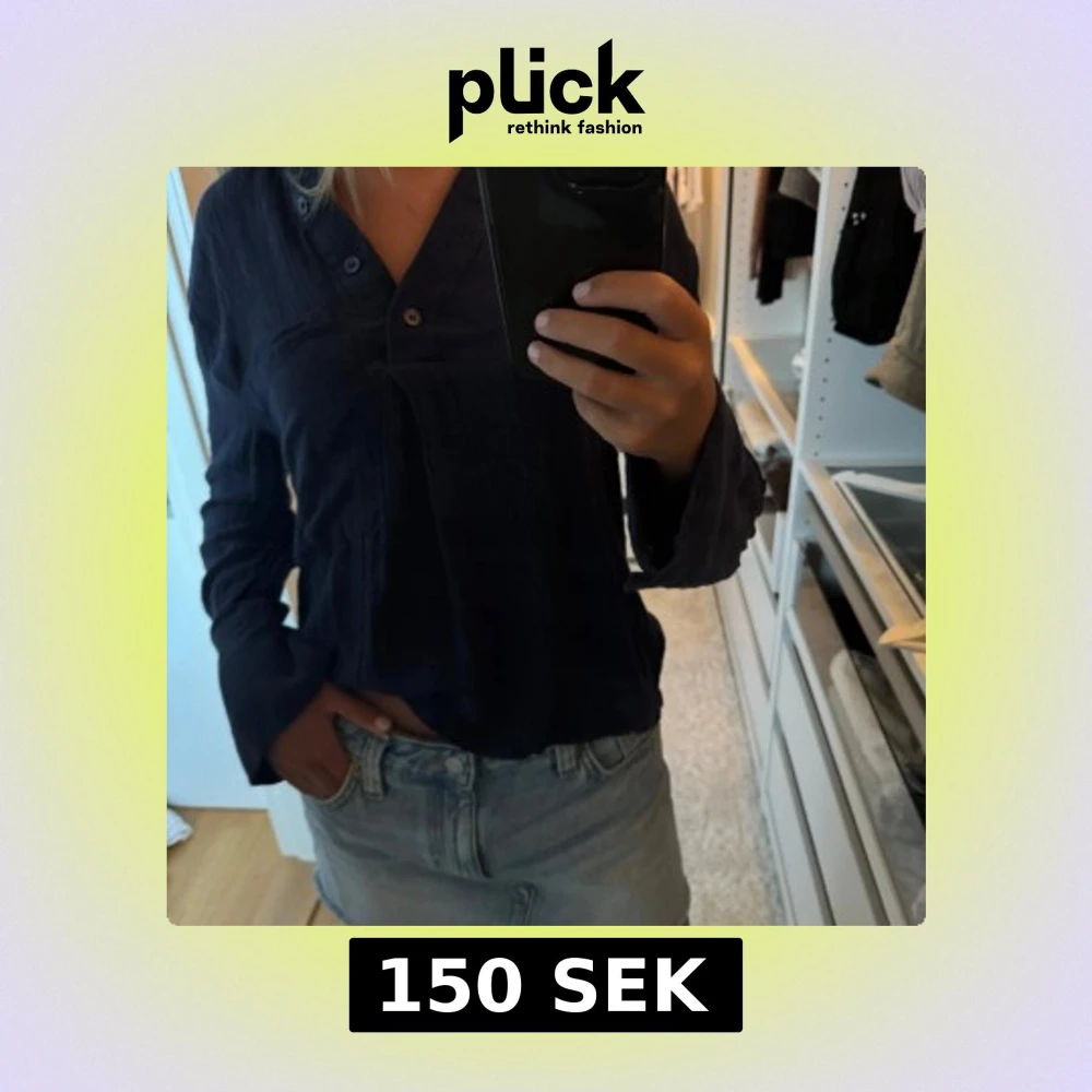 Snygg mörkblå blus med lång ärm och avslappnad passform. Blusen har v-ringning med knappar framtill och lätt struktur i tyget. Perfekt till jeans eller kjol.