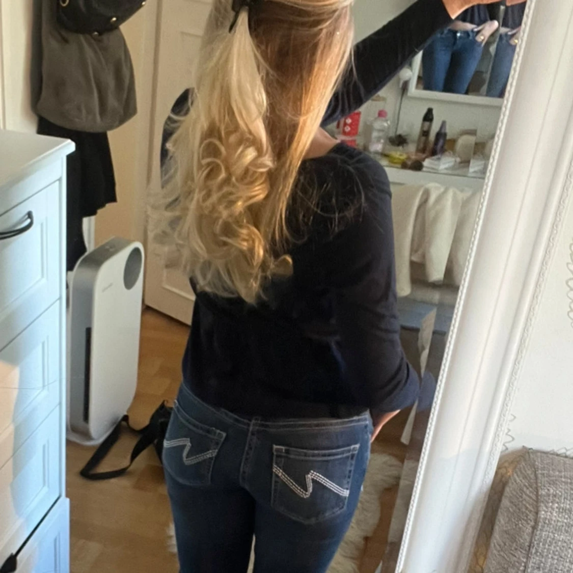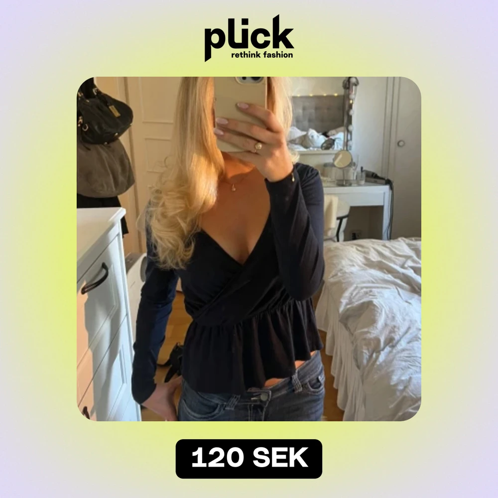 En jättefin marinblå/mörkblå topp. Designen är omlott och man kan välja lite själv hur djupt man vill att v-ritningen ska gå. TIPS!!! Om man inte vill ha så v-ringat och att den ska hålla sig på plats så kan man sätta dit ett örhänge🥰(se sista bild)