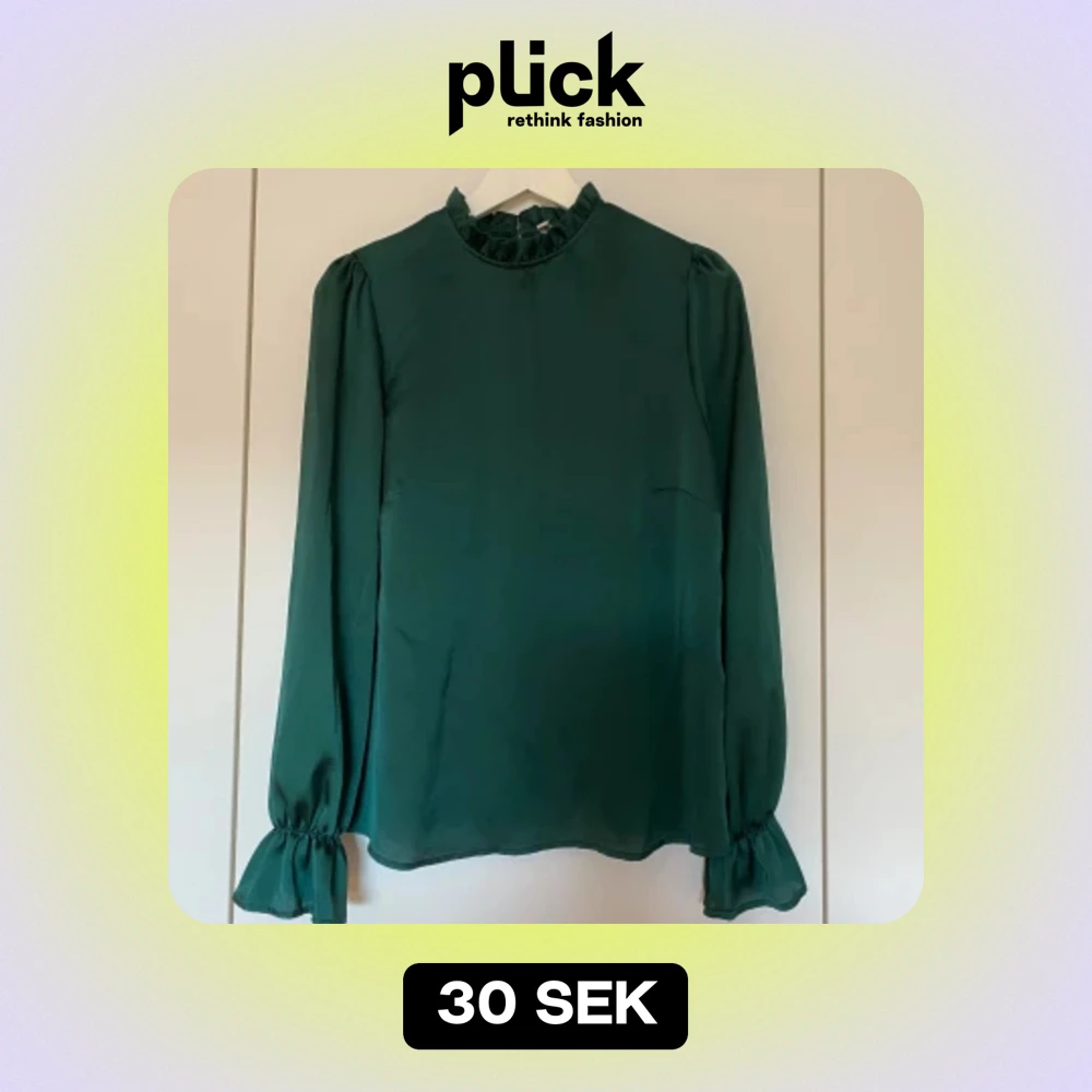 Mörkgrön blus i glansigare material. Lite volanger vid kragen samt nedtill vid armarna. Storlek 34 från Nelly, passar även som 36 då den är lite större i storleken