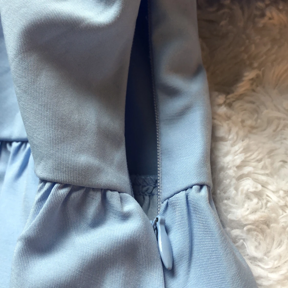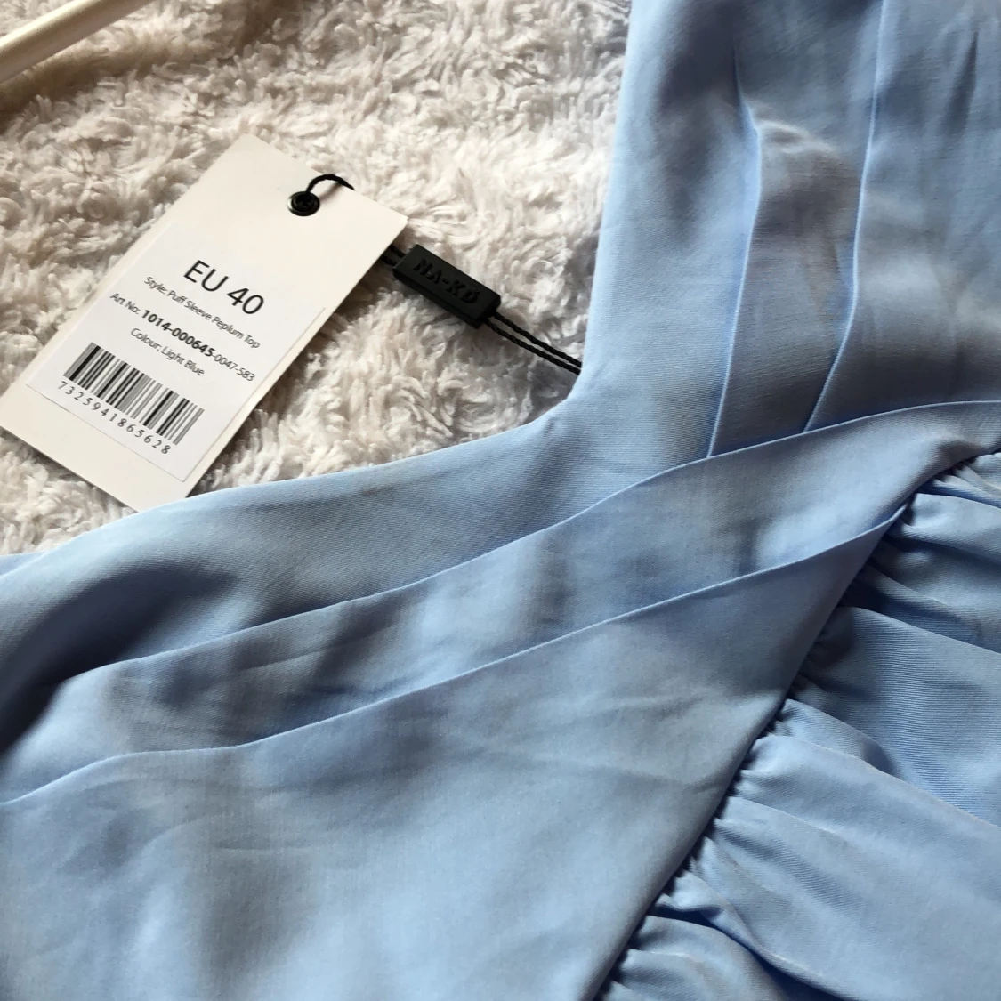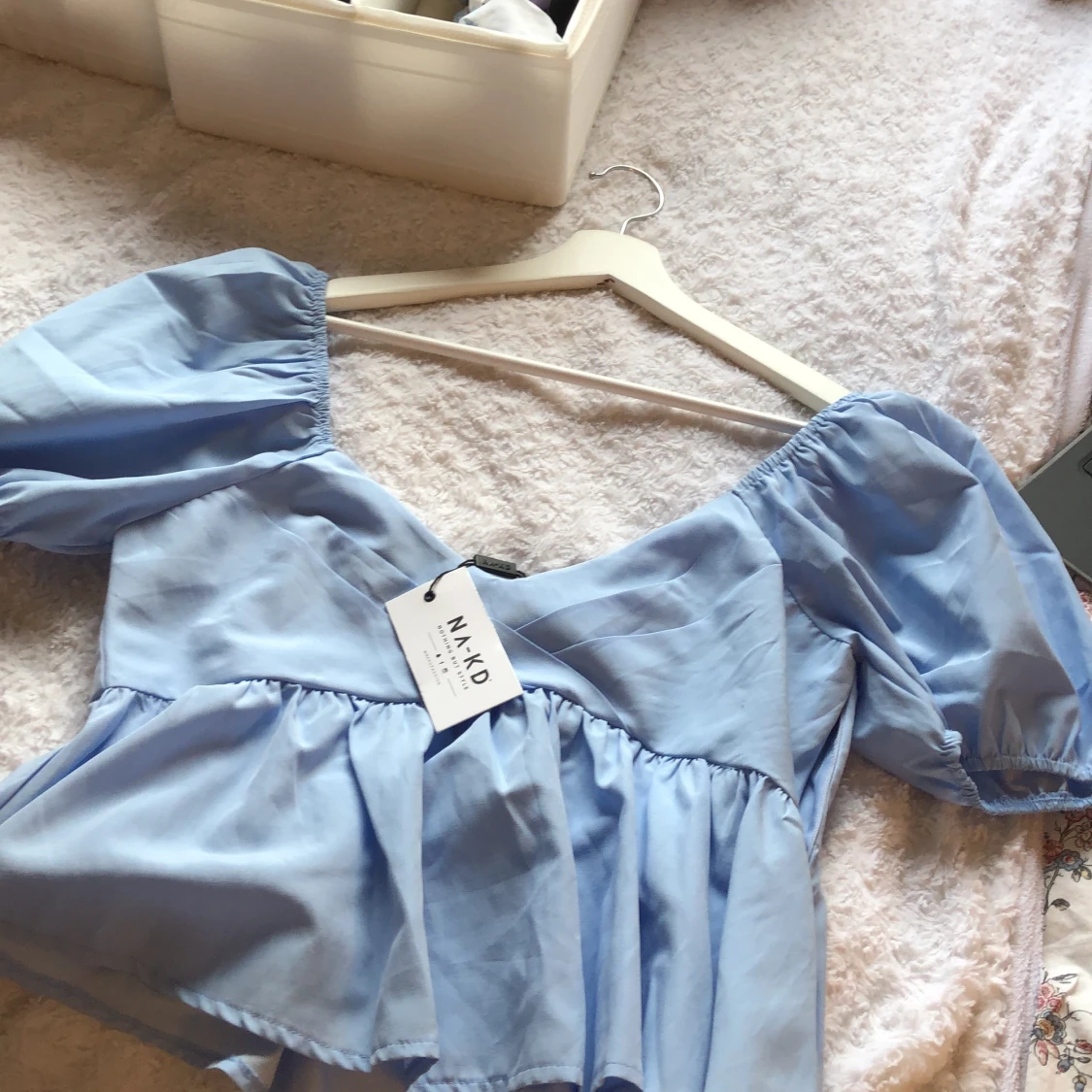 Jättefin ljusblå topp från Nakd. Aldrig använd, prislappen sitter kvar. Storlek 40 men sitter som 38. Fina volanger på ärmarna och nedanför magen.