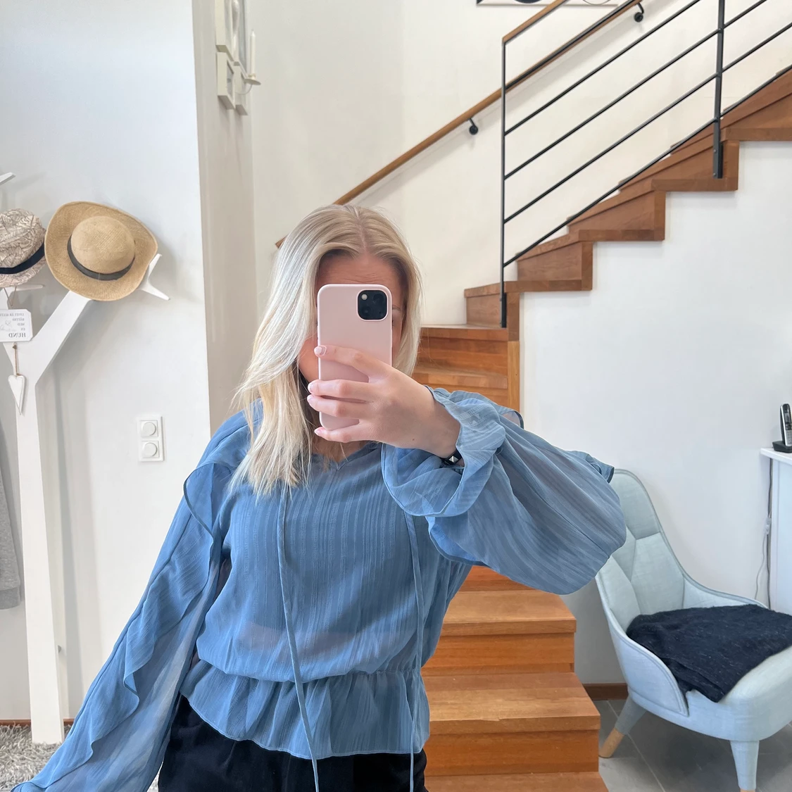 En blå blus i ett tunt material som endast är använt 1 gång. Som ny!