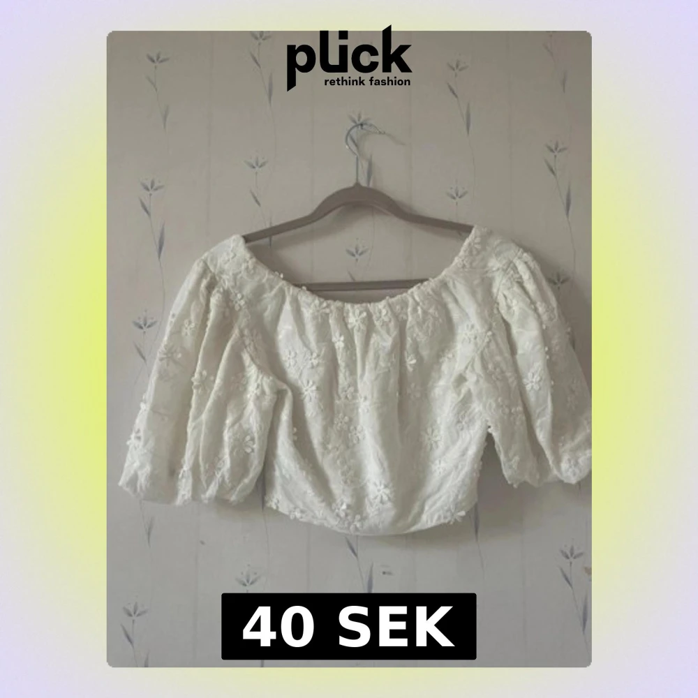 Superfin vit blus med broderade blommor och puffiga korta ärmar. Blusen har en bred, elastisk halsringning. Perfekt för sommarens alla tillfällen!