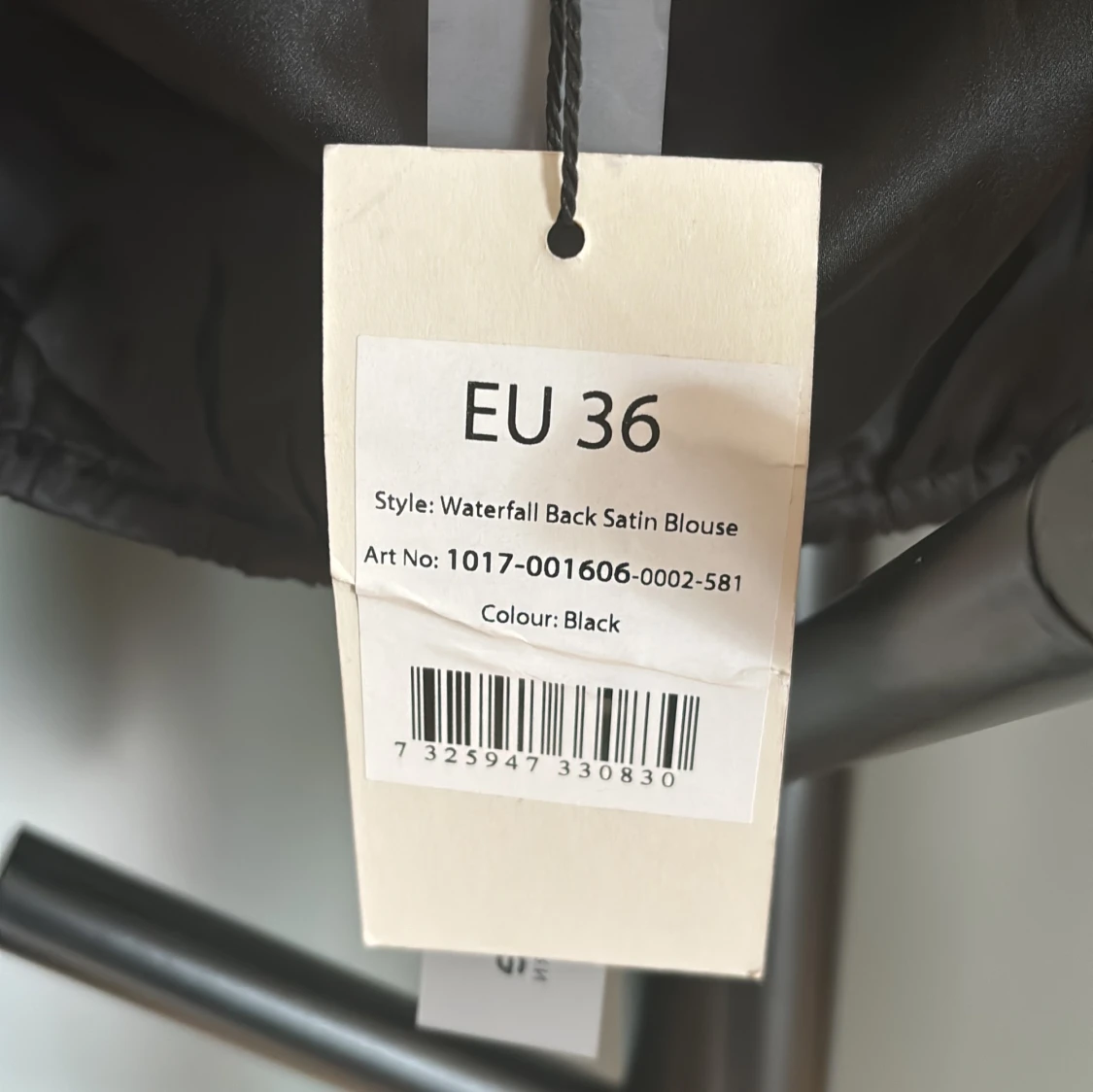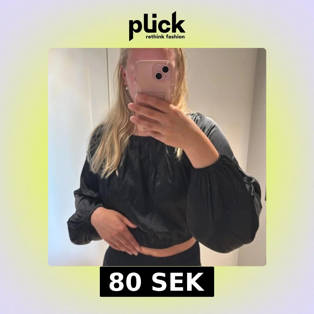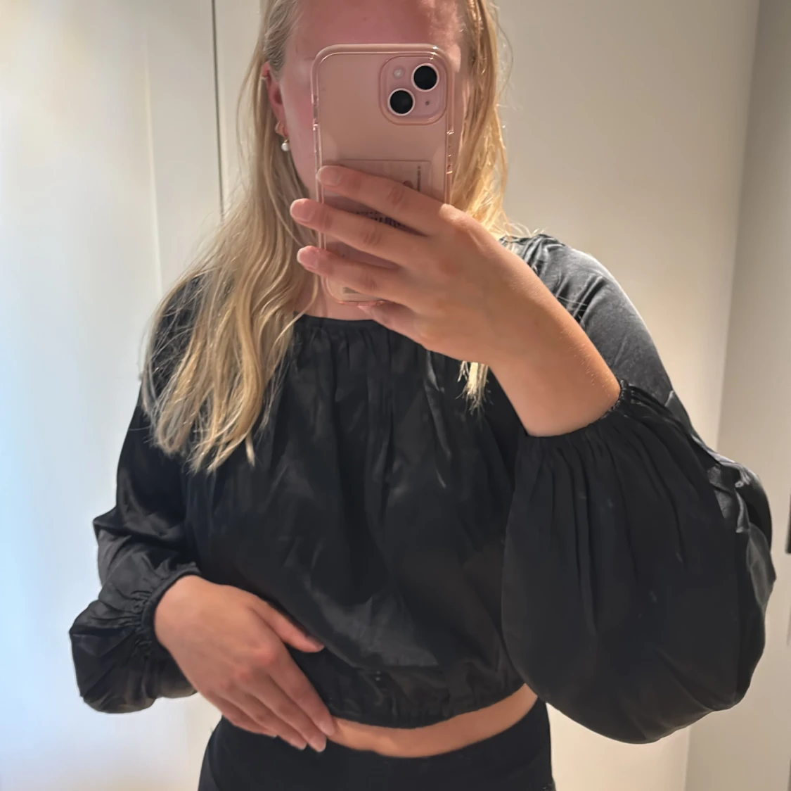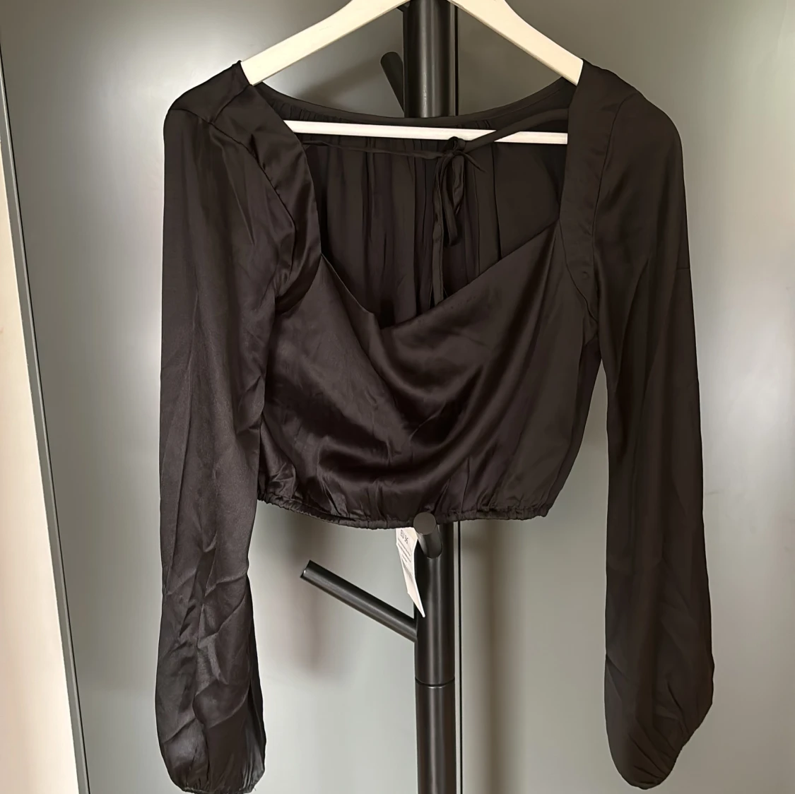Snygg svart blus i satin med croppad passform och långa ärmar. Blusen har en draperad framsida och knytband i ryggen som ger en cool detalj. Perfekt för dig som gillar trendiga och stilrena plagg med lite extra edge.