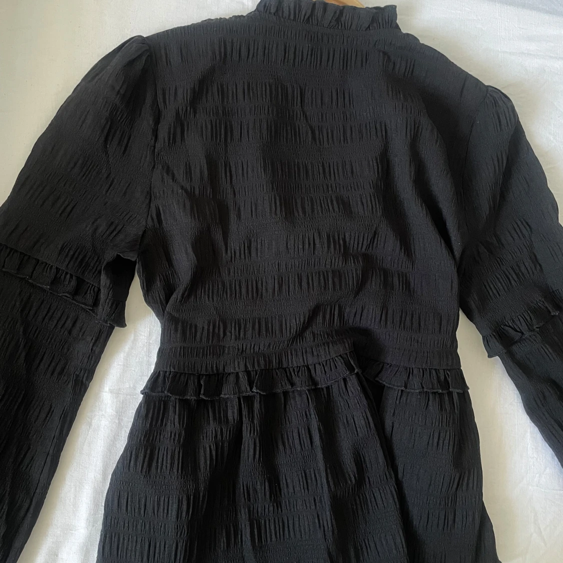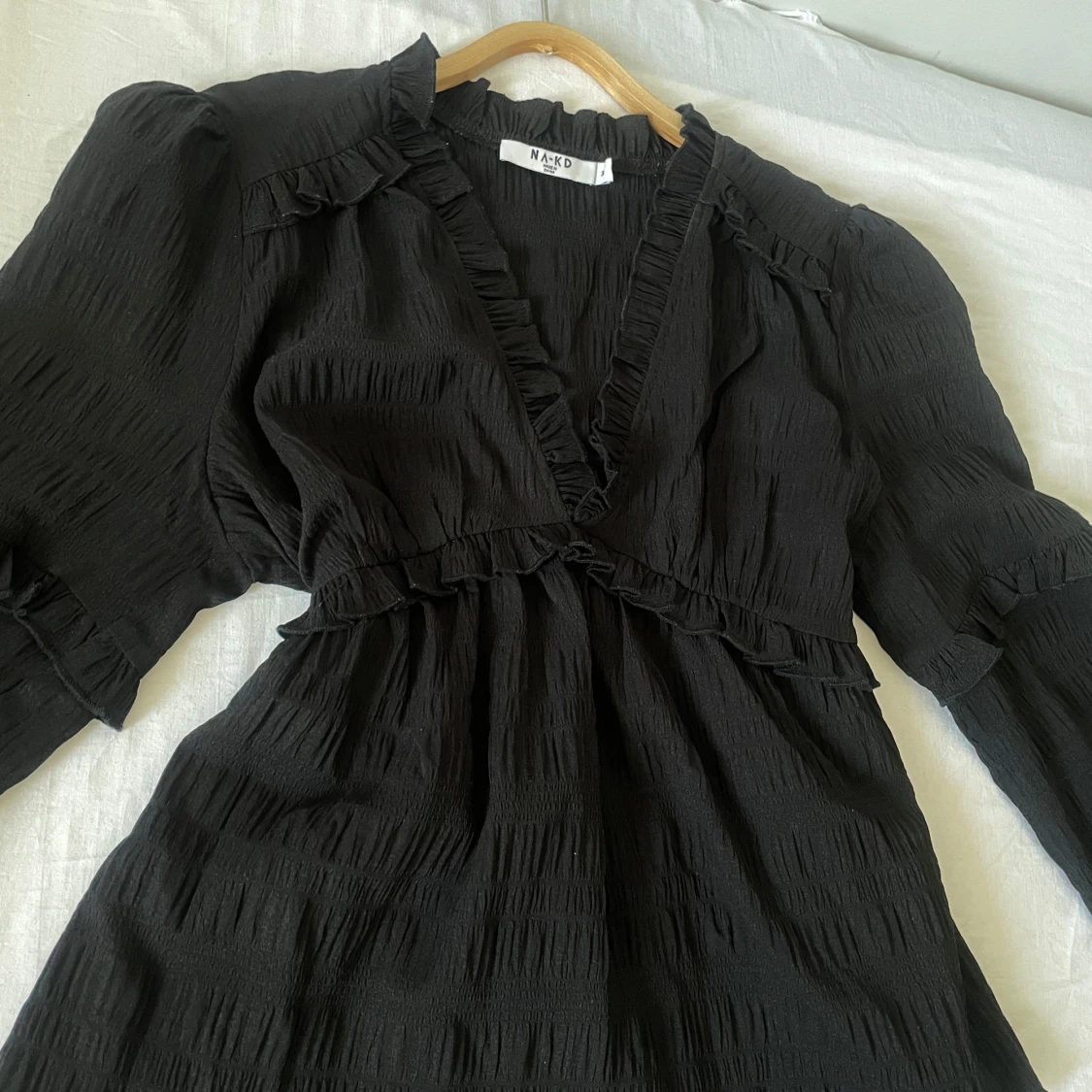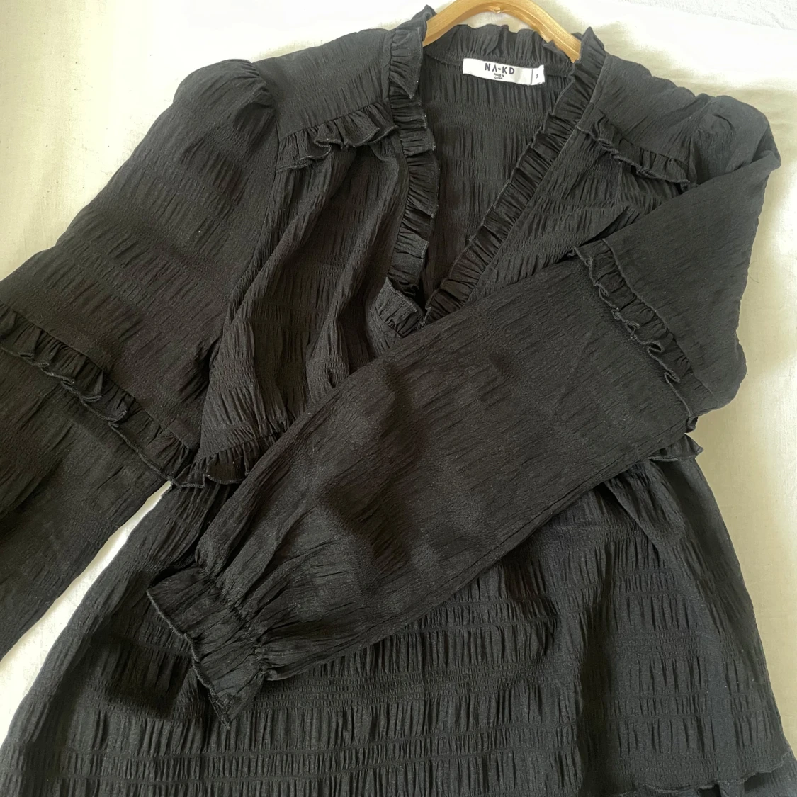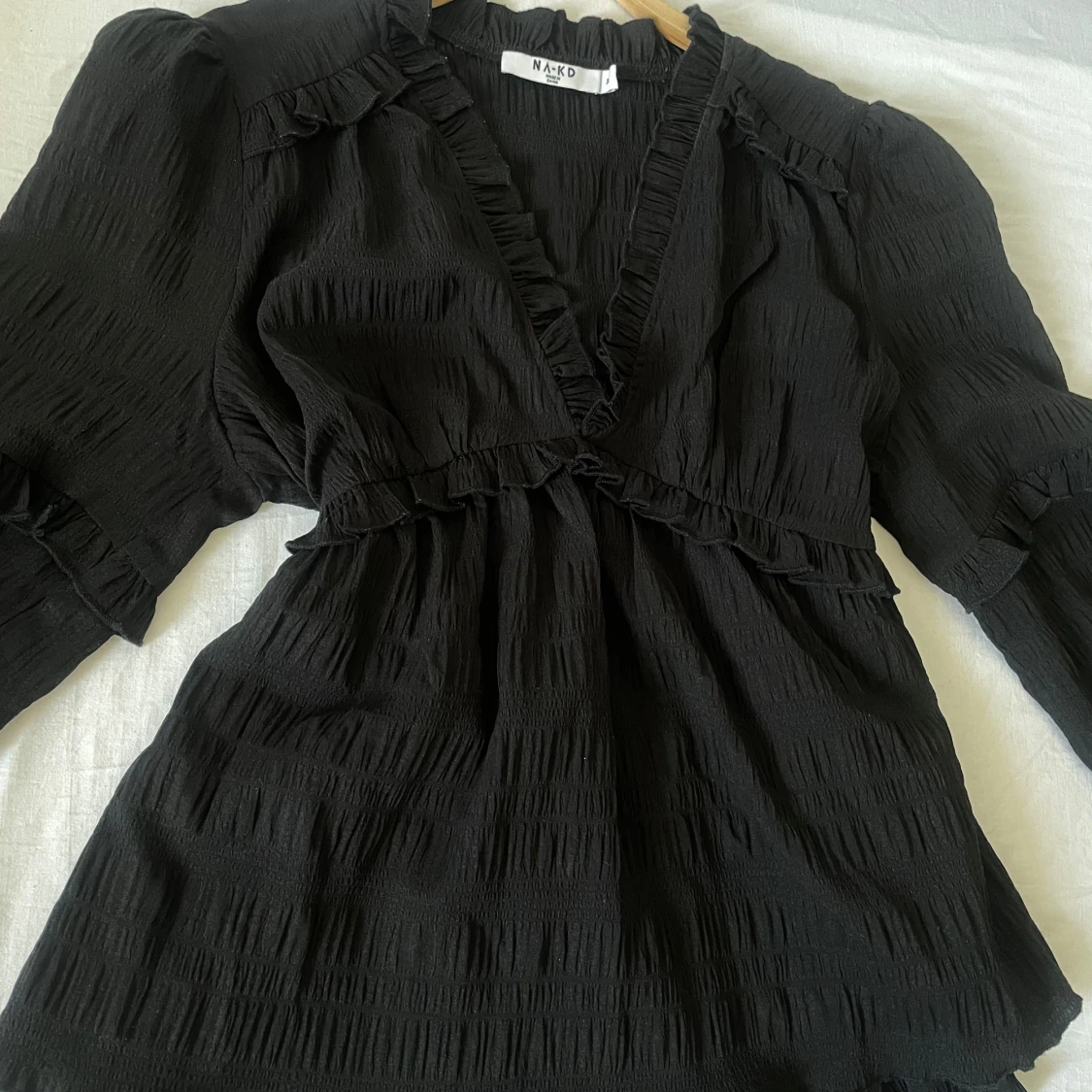 Snygg svart blus från NA-KD med volangdetaljer och v-ringning. Blusen har långa ärmar och en lätt textur i tyget som ger en elegant look. Perfekt för att klä upp eller ner beroende på tillfälle.