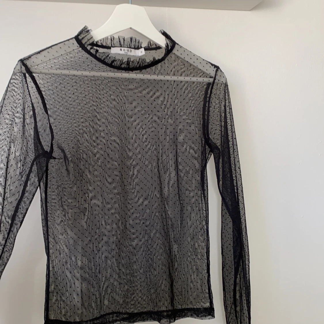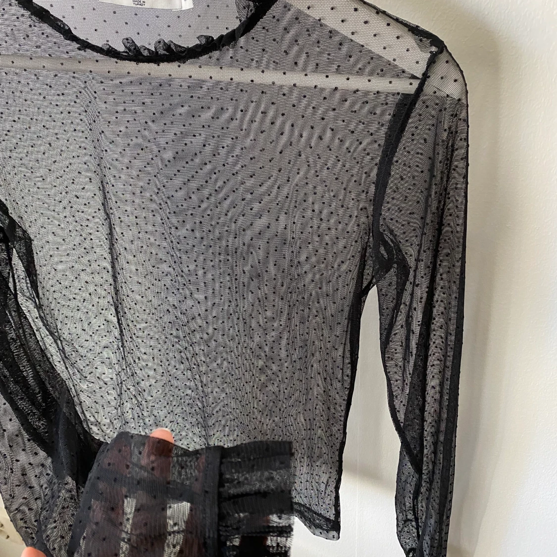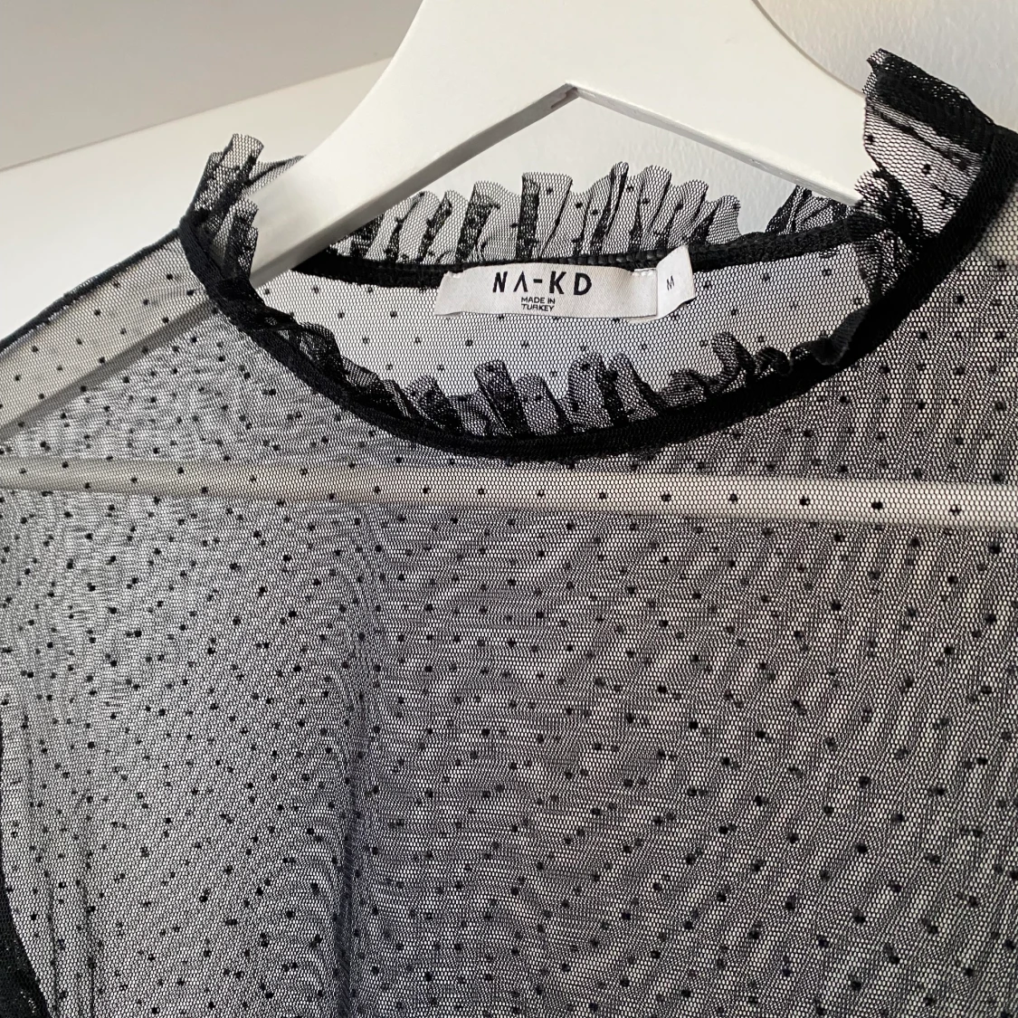 genomskynlig blus med prickar och volanger vid hals och ärm. Storlek M , 90kr